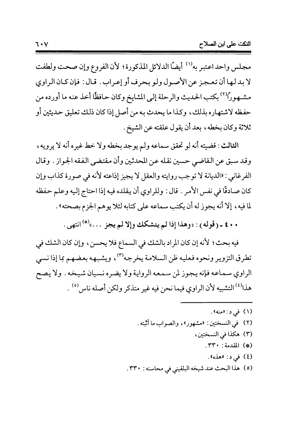مجْلِس وَاحِد اعْتبر بِهِ (1) أَيْضا الدَّلَائِل الْمَذْكُورَة لِأَن الْفُرُوع وَإِن صحت ولطفت لَا بُد لَهَا أَن تعجز عَن الْأُصُول وَلَو بِحرف أَو إِعْرَاب قَالَ فَإِن كَانَ الرَّاوِي مَشْهُورا (2) بكتب الحَدِيث والرحلة إِلَى الْمَشَايِخ وَكَانَ حَافِظًا أَخذ عَنهُ مَا أوردهُ من حفظه لاشتهاره بذلك وَكَذَا مَا يحدث بِهِ من أصل إِذا كَانَ ذَلِك تَعْلِيق حديثين أَو ثَلَاثَة وَكَانَ بِخَطِّهِ بعد أَن يَقُول علقته عَن الشَّيْخ