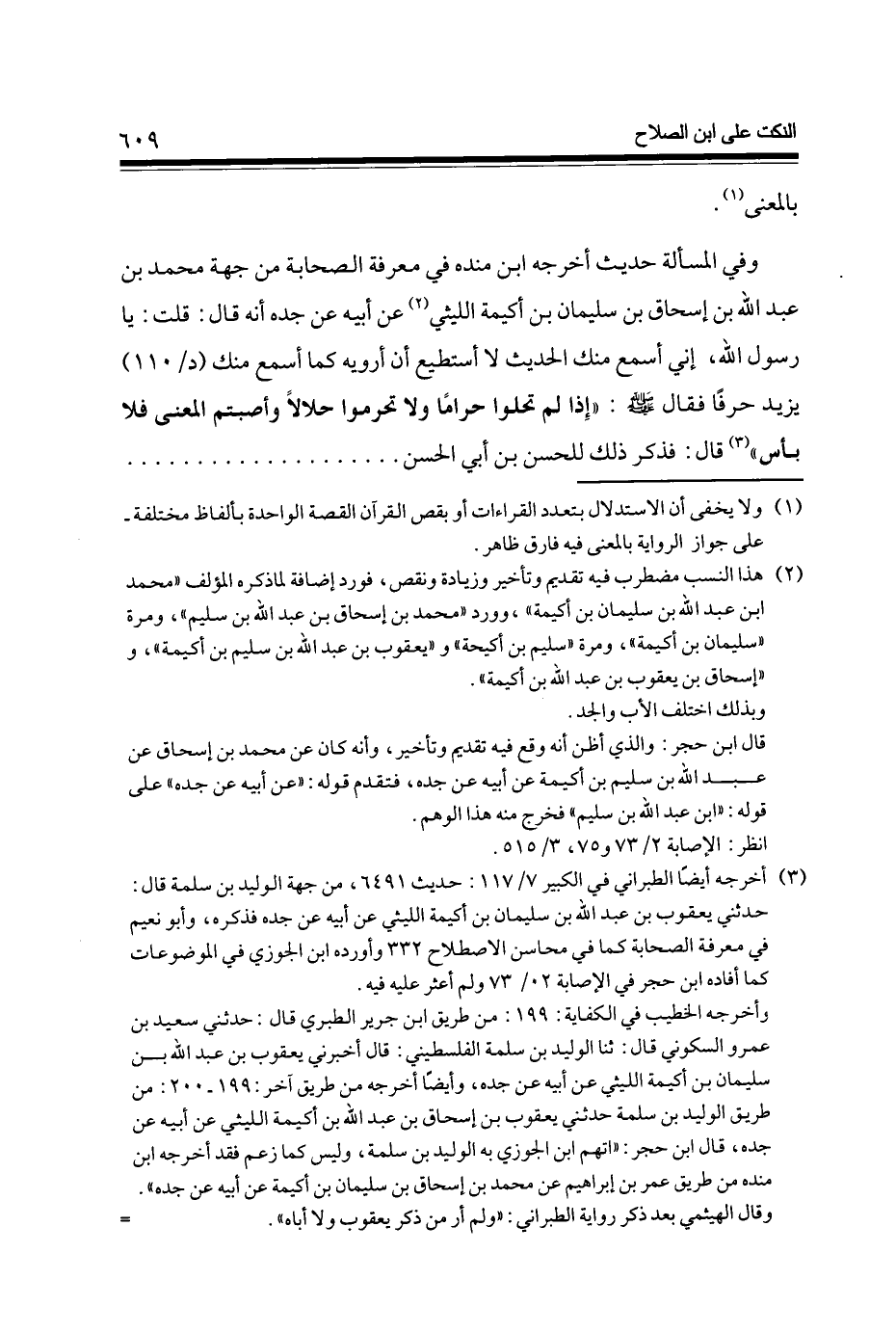 وَفِي الْمَسْأَلَة حَدِيث أخرجه ابْن مَنْدَه فِي معرفَة الصَّحَابَة من جِهَة مُحَمَّد بن عبد الله بن إِسْحَاق بن سُلَيْمَان بن أكيمَة اللَّيْثِيّ (2) عَن أَبِيه عَن جده أَنه قَالَ قلت يَا رَسُول الله إِنِّي أسمع مِنْك الحَدِيث لَا أَسْتَطِيع أَن أرويه كَمَا أسمع مِنْك (د / 110) يزِيد حرفا فَقَالَ صلى الله عَلَيْهِ وَسلم إِذا لم تحلوا حَرَامًا وَلَا تحرموا حَلَالا وأصبتم الْمَعْنى فَلَا بَأْس (3) قَالَ فَذكر ذَلِك لِلْحسنِ بن أبي الْحسن