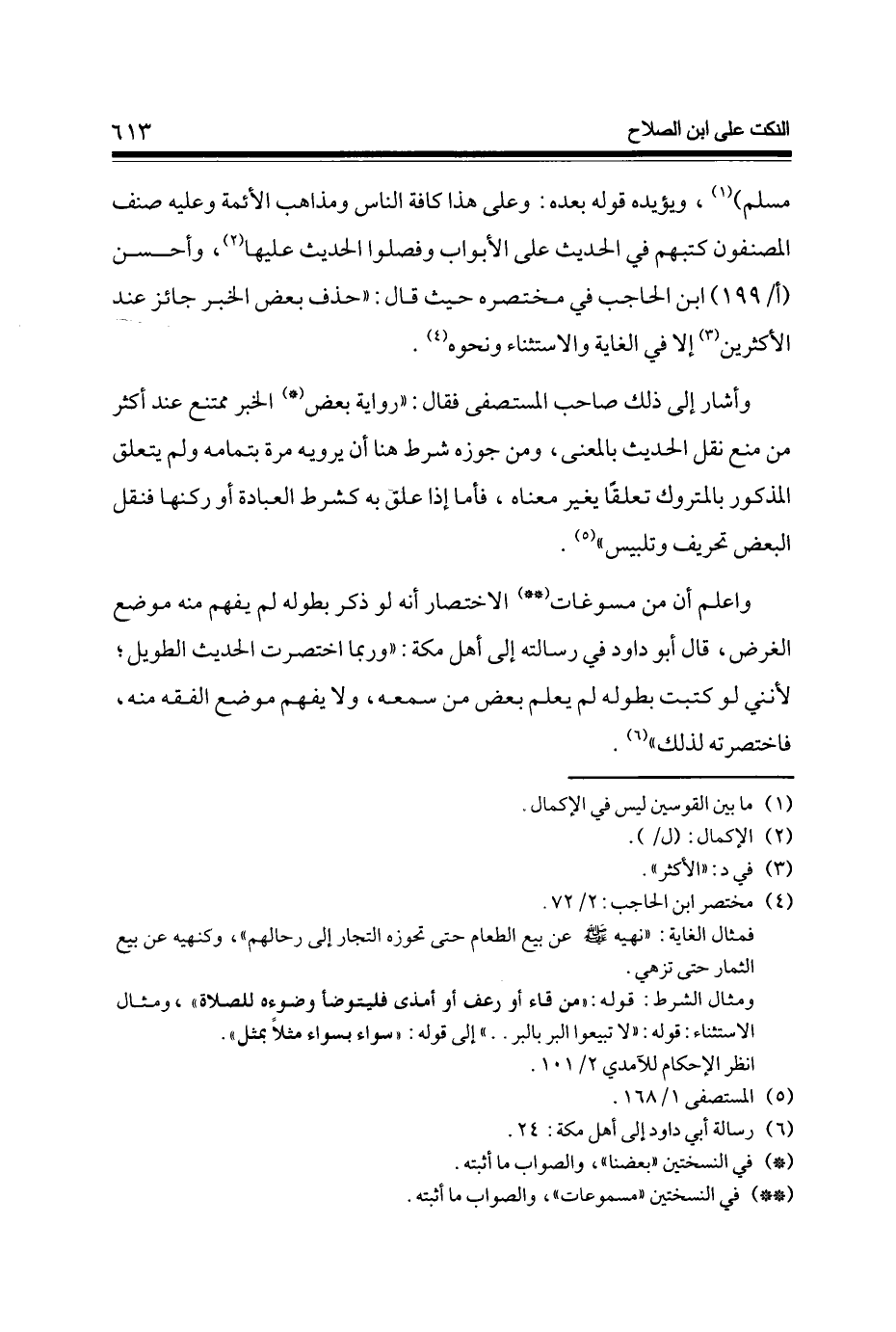 مُسلم (1) وَيُؤَيِّدهُ قَوْله بعده وعَلى هَذَا كَافَّة النَّاس ومذاهب الْأَئِمَّة وَعَلِيهِ صنف المصنفون كتبهمْ فِي الحَدِيث على الْأَبْوَاب وفصلوا الحَدِيث عَلَيْهَا (2) وَأحسن (أ / 199) ابْن الْحَاجِب فِي مُخْتَصره حَيْثُ قَالَ حذف بعض الْخَبَر جَائِز عِنْد الْأَكْثَرين (3) إِلَّا فِي الْغَايَة وَالِاسْتِثْنَاء وَنَحْوه (4)