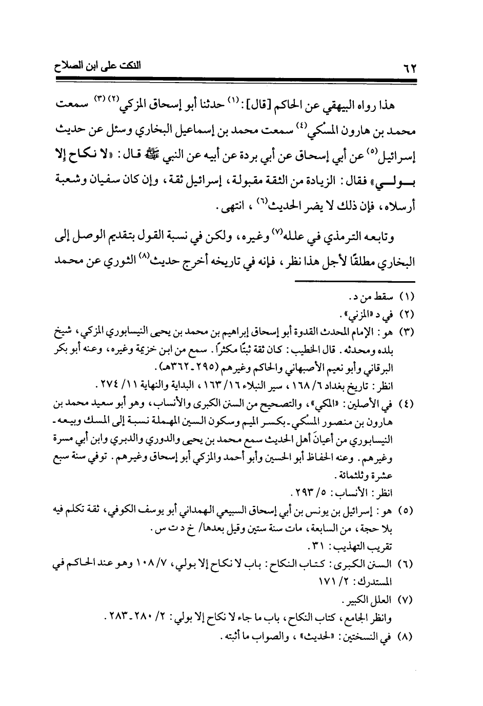 هَذَا رَوَاهُ الْبَيْهَقِيّ عَن الْحَاكِم [قَالَ] حَدثنَا أَبُو إِسْحَاق الْمُزَكي سَمِعت مُحَمَّد بن هَارُون المسكي سَمِعت مُحَمَّد بن إِسْمَاعِيل البُخَارِيّ وَسُئِلَ عَن حَدِيث إِسْرَائِيل عَن أبي إِسْحَاق عَن أبي بردة عَن أَبِيه عَن النَّبِي صلى الله عَلَيْهِ وَسلم قَالَ لَا نِكَاح إِلَّا بولِي فَقَالَ الزِّيَادَة من الثِّقَة مَقْبُولَة إِسْرَائِيل ثِقَة وَإِن كَانَ سُفْيَان وَشعْبَة أَرْسلَاهُ فَإِن ذَلِك لَا يضر الحَدِيث انْتهى