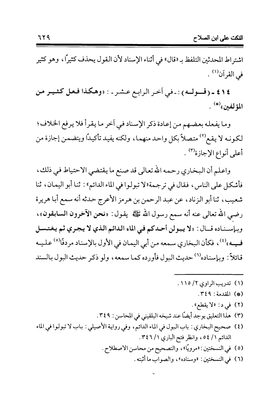 414 - (قَوْله) فِي آخر الرَّابِع عشر - وَهَكَذَا فعل كثير من المؤلفين (4 5 6 7 8 9 10 11 حَدِيث الْبَوْل فَأوردهُ كَمَا سَمعه وَلَو ذكر حَدِيث الْبَوْل بالسند