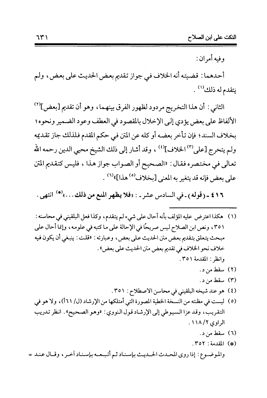 الثَّانِي أَن هَذَا التَّخْرِيج مَرْدُود لظُهُور الْفرق بَينهمَا وَهُوَ أَن تَقْدِيم [بعض] (2) الْأَلْفَاظ على بعض يُؤَدِّي إِلَى الْإِخْلَال بِالْمَقْصُودِ فِي الْعَطف وعود الضَّمِير وَنَحْوه بِخِلَاف السَّنَد فَإِن تَأَخّر بعضه أَو كُله عَن الْمَتْن فِي حكم الْمُقدم فَلذَلِك جَازَ تَقْدِيمه وَلم يتَخَرَّج [على (3) الْخلاف] (4) وَقد أَشَارَ إِلَى ذَلِك الشَّيْخ محيي الدّين رَحمَه الله تَعَالَى فِي مُخْتَصره فقا ل الصَّحِيح أَو الصَّوَاب جَوَاز هَذَا فَلَيْسَ كتقديم الْمَتْن على بعض فَإِنَّهُ قد يتَغَيَّر بِهِ الْمَعْنى [بِخِلَاف (5) هَذَا] (6)