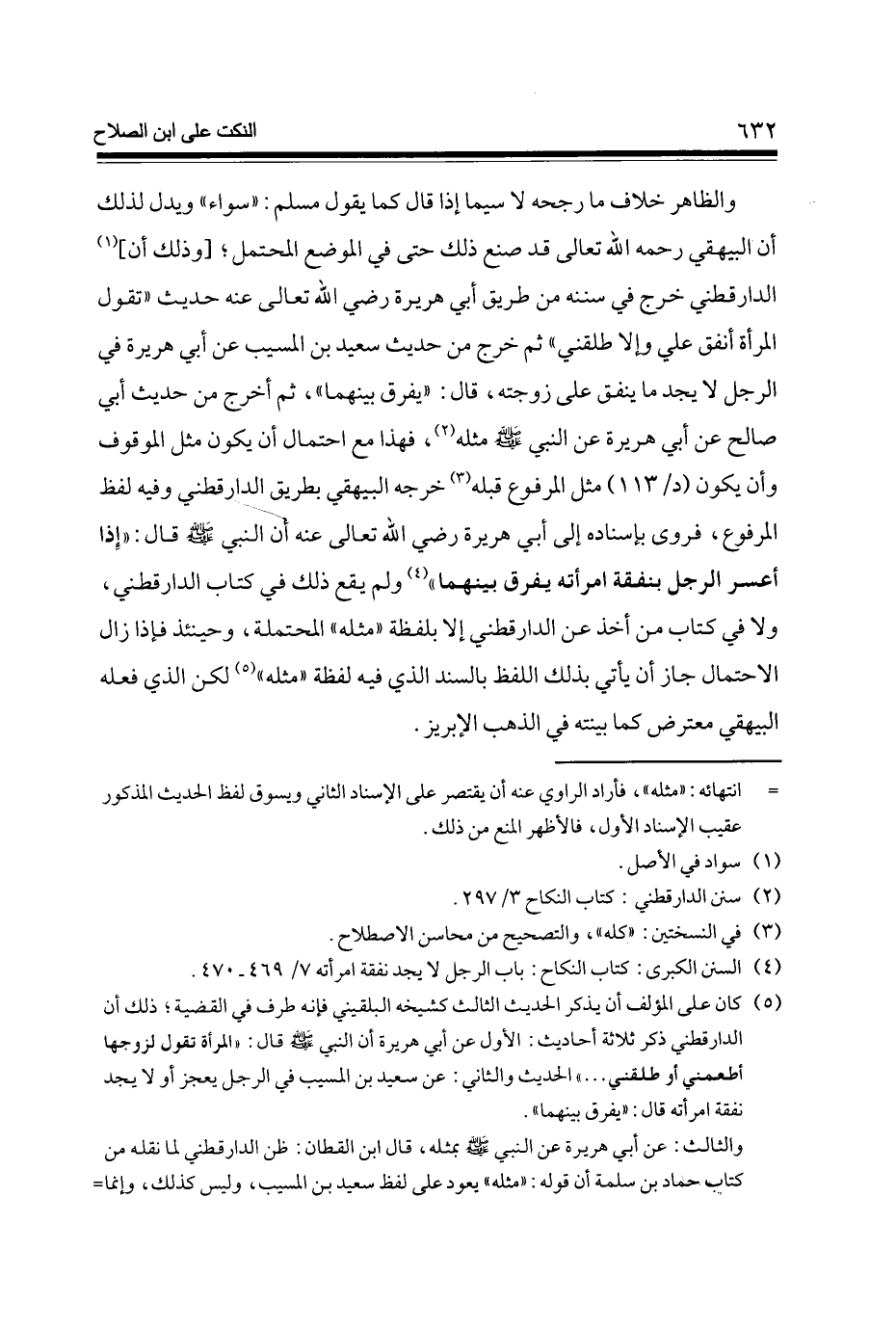 وَالظَّاهِر خلاف مَا رَجحه لَا سِيمَا إِذا قَالَ كَمَا يَقُول مُسلم سَوَاء وَيدل لذَلِك أَن الْبَيْهَقِيّ رَحمَه الله تَعَالَى قد صنع ذَلِك حَتَّى فِي الْموضع الْمُحْتَمل [وَذَلِكَ أَن] (1) الدَّارَقُطْنِيّ خرج فِي سنَنه من طَرِيق أبي هُرَيْرَة رَضِي الله تَعَالَى عَنهُ حَدِيث تَقول الْمَرْأَة أنْفق عَليّ وَإِلَّا طَلقنِي ثمَّ خرج من حَدِيث سعيد بن الْمسيب عَن أبي هُرَيْرَة فِي الرجل لَا يجد مَا ينْفق على زَوجته قَالَ يفرق بَينهمَا ثمَّ أخرج من حَدِيث أبي صَالح عَن أبي هُرَيْرَة عَن النَّبِي صلى الله عَلَيْهِ وَسلم مثله (2) فَهَذَا مَعَ احْتِمَال أَن يكون مثل الْمَوْقُوف وَأَن يكون (د / 113) مثل الْمَرْفُوع قبله (3) خرجه الْبَيْهَقِيّ بطرِيق الدَّارَقُطْنِيّ وَفِيه لفظ الْمَرْفُوع فروى بِإِسْنَادِهِ إِلَى أبي هُرَيْرَة رَضِي الله تَعَالَى عَنهُ أَن النَّبِي صلى الله عَلَيْهِ وَسلم قَالَ إِذا أعْسر الرجل بِنَفَقَة امْرَأَته يفرق بَينهمَا (4) وَلم يَقع ذَلِك فِي كتاب الدَّارَقُطْنِيّ وَلَا فِي كتاب من أَخذ عَن الدَّارَقُطْنِيّ إِلَّا بِلَفْظَة مثله المحتملة وَحِينَئِذٍ فَإِذا زَالَ الِاحْتِمَال جَازَ أَن يَأْتِي بذلك اللَّفْظ بالسند الَّذِي فِيهِ لَفْظَة مثله (5) لَكِن الَّذِي فعله الْبَيْهَقِيّ معترض كَمَا بَينته فِي الذَّهَب الإبريز