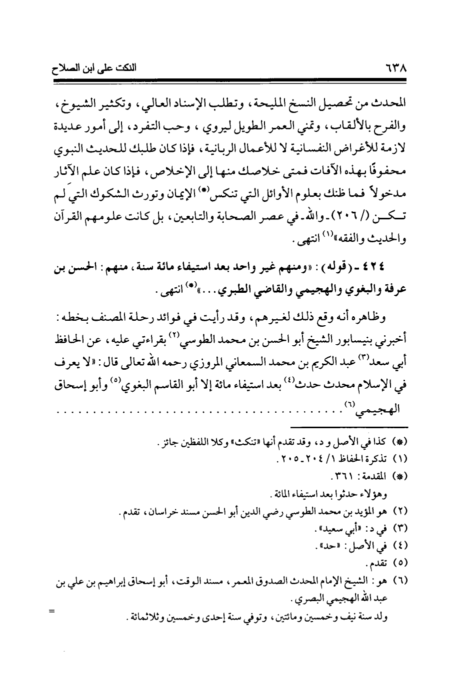 وَظَاهره أَنه وَقع ذَلِك لغَيرهم وَقد رَأَيْت فِي فَوَائِد رحْلَة المُصَنّف بِخَطِّهِ أَخْبرنِي بنيسابور الشَّيْخ أَبُو الْحسن بن مُحَمَّد الطوسي (2) بِقِرَاءَتِي عَلَيْهِ عَن الْحَافِظ أبي سعد (3) عبد الْكَرِيم بن مُحَمَّد السَّمْعَانِيّ الْمروزِي رَحمَه الله تَعَالَى قَالَ لَا يعرف فِي الْإِسْلَام مُحدث حدث (4) بعد اسْتِيفَاء مائَة إِلَّا أَبُو الْقَاسِم الْبَغَوِيّ (5) وَأَبُو إِسْحَاق الهُجَيْمِي (6)