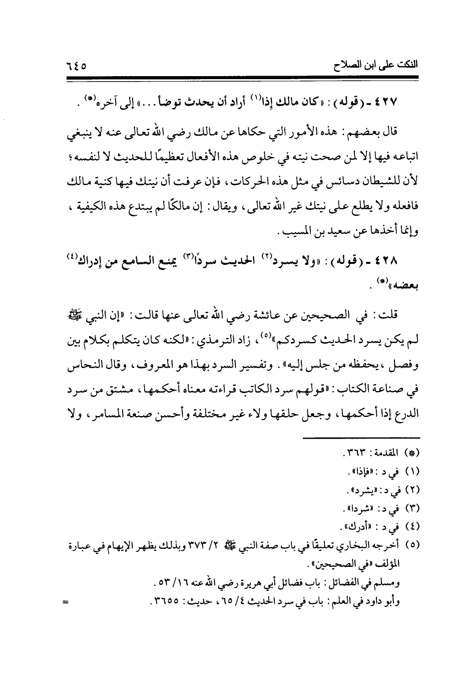 قلت فِي الصَّحِيحَيْنِ عَن عَائِشَة رَضِي الله تَعَالَى عَنْهَا قَالَت إِن النَّبِي صلى الله عَلَيْهِ وَسلم لم يكن يسْرد الحَدِيث كَسَرْدِكُمْ (5) زَاد التِّرْمِذِيّ لكنه كَانَ يتَكَلَّم بِكَلَام بَين وَفصل يحفظه من جلس إِلَيْهِ وَتَفْسِير السرد بِهَذَا هُوَ الْمَعْرُوف وَقَالَ النّحاس فِي صناعَة الْكتاب قَوْلهم سرد الْكَاتِب قِرَاءَته مَعْنَاهُ أحكمها مُشْتَقّ من سرد الدرْع إِذا أحكمها وَجعل حلقها وَلَاء غير مُخْتَلفَة وَأحسن صنة المسامر وَلَا