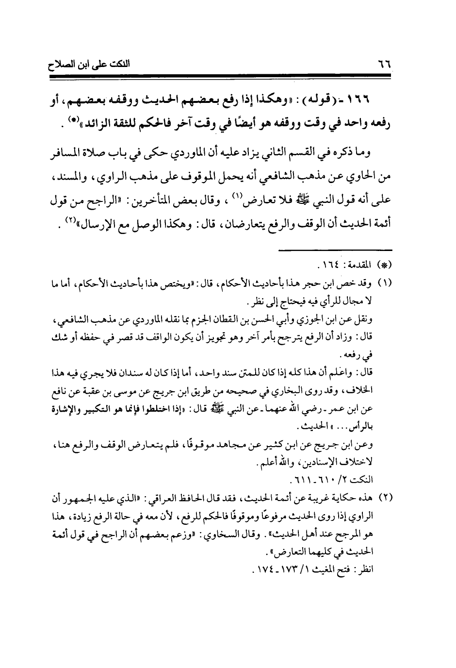 166 - (قَوْله) وَهَكَذَا إِذا رفع بَعضهم الحَدِيث وَوَقفه بَعضهم أَو رَفعه وَاحِد فِي وَقت وَوَقفه هُوَ أَيْضا فِي وَقت آخر فَالْحكم للثقة الزَّائِد
