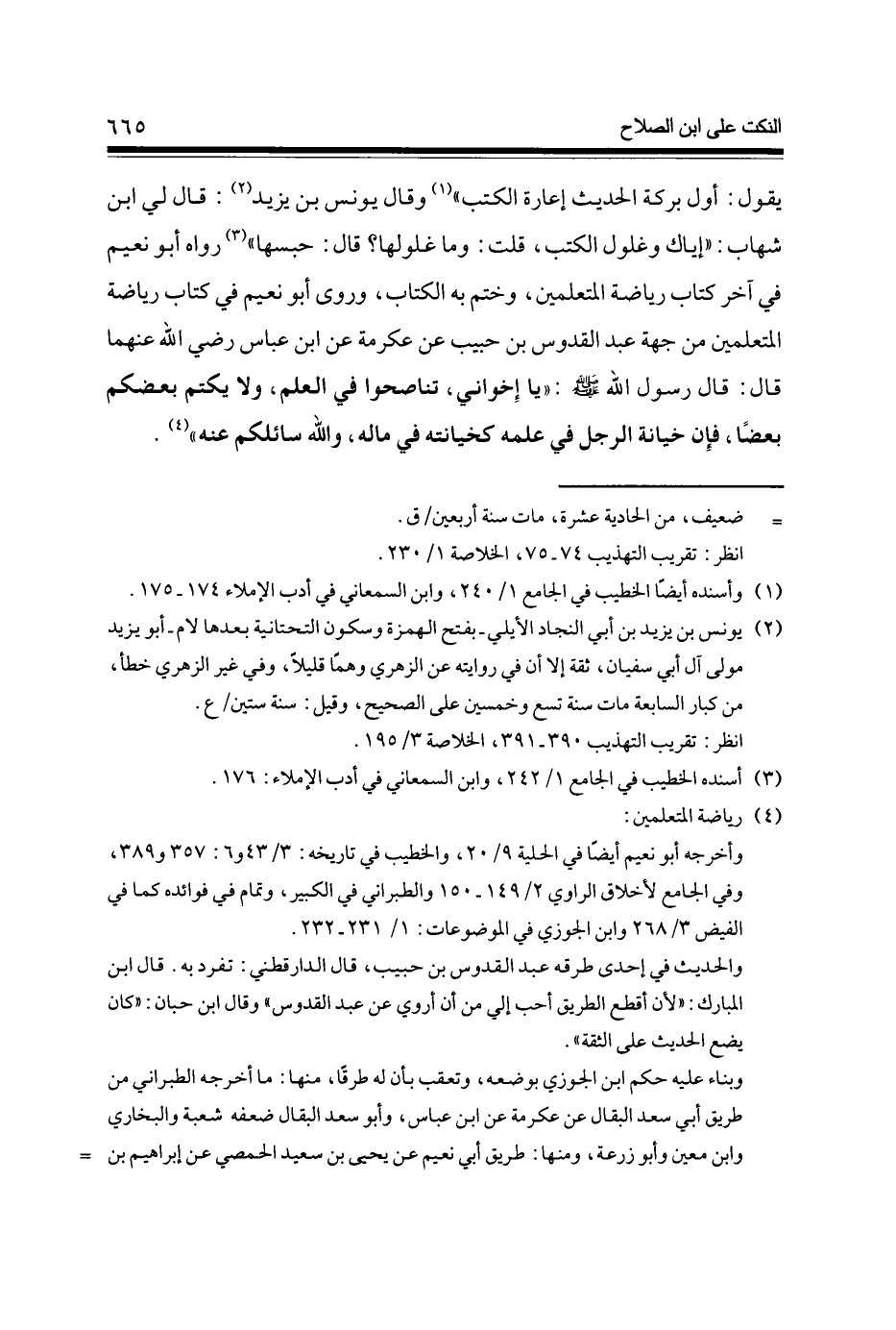 يَقُول أول بركَة الحَدِيث إِعَارَة الْكتب (1) وَقَالَ يُونُس بن يزِيد (2) قَالَ لي ابْن شهَاب إياك وَغُلُول الْكتب قلت وَمَا غلولها قَالَ حَبسهَا (3) رَوَاهُ أَبُو نعيم فِي آخر كتاب رياضة المتعلمين وَختم بِهِ الْكتاب وروى أَبُو نعيم فِي كتاب رياضة المتعلمين من جِهَة عبد القدوس بن حبيب عَن عِكْرِمَة عَن ابْن عَبَّاس رَضِي الله عَنْهُمَا قَالَ قَالَ رَسُول الله صلى الله عَلَيْهِ وَسلم يَا إخْوَانِي تناصحوا فِي الْعلم وَلَا يكتم بَعْضكُم بَعْضًا فَإِن خِيَانَة الرجل فِي علمه كخيانته فِي مَاله وَالله سَائِلكُمْ عَنهُ (4)