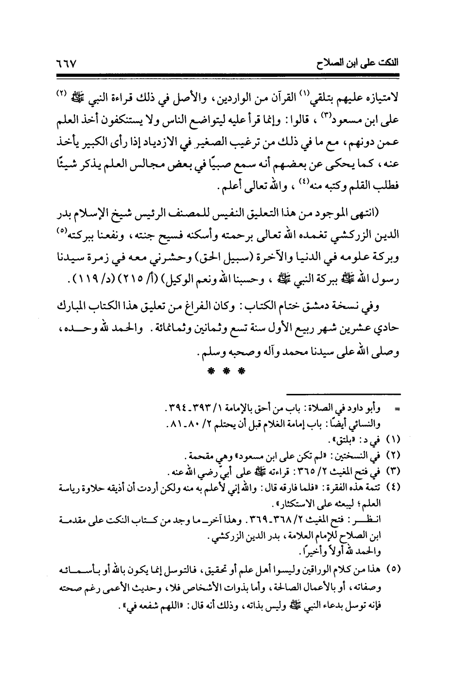 (انْتهى الْمَوْجُود من هَذَا التَّعْلِيق النفيس للْمُصَنف الرئيس شيخ الْإِسْلَام بدر الدّين الزَّرْكَشِيّ تغمده الله تَعَالَى برحمته وَأَسْكَنَهُ فسيح جنته ونفعنا ببركته (5) وبركة علومه فِي الدُّنْيَا وَالْآخِرَة (سَبِيل الْحق) وحشرني مَعَه فِي زمرة سيدنَا رَسُول الله صلى الله عَلَيْهِ وَسلم ببركة النَّبِي صلى الله عَلَيْهِ وَسلم وحسبنا الله وَنعم الْوَكِيل) (أ / 215) (د / 119)