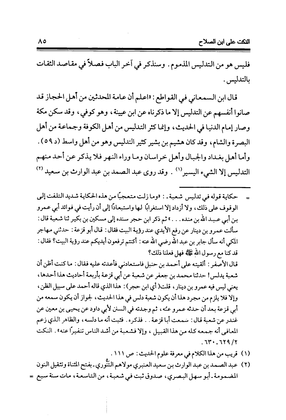 قَالَ ابْن السَّمْعَانِيّ فِي القواطع اعْلَم أَن عَامَّة الْمُحدثين من أهل الْحجاز قد صانوا أنفسهم عَن التَّدْلِيس إِلَّا مَا ذَكرْنَاهُ عَن ابْن عُيَيْنَة وَهُوَ كُوفِي وَقد سكن مَكَّة وَصَارَ إِمَام الدُّنْيَا فِي الحَدِيث وَإِنَّمَا كثر التَّدْلِيس من أهل الْكُوفَة وَجَمَاعَة من أهل الْبَصْرَة وَالشَّام وَقد كَانَ هشيم بن بشير كثير التَّدْلِيس وَهُوَ من أهل وَاسِط (د 59) وَأما أهل بَغْدَاد وَالْجِبَال وَأهل خُرَاسَان وَمَا وَرَاء النَّهر فَلَا يذكر عَن أحد مِنْهُم التَّدْلِيس إِلَّا الشَّيْء الْيَسِير وَقد روى عبد الصَّمد بن عبد الْوَارِث بن سعيد