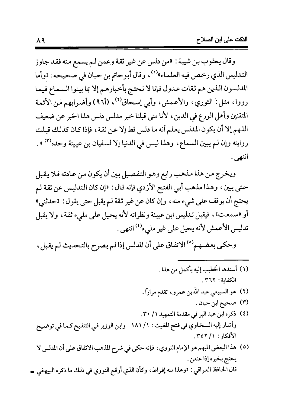 وَقَالَ يَعْقُوب بن شيبَة من دلّس عَن غير ثِقَة وَعَمن لم يسمع مِنْهُ فقد جَاوز التَّدْلِيس الَّذِي رخص فِيهِ الْعلمَاء وَقَالَ أَبُو حَاتِم بن حبَان فِي صَحِيحه وَأما المدلسون الَّذين هم ثِقَات عدُول فَإنَّا لَا نحتج بأخبارهم إِلَّا بِمَا بينوا السماع فِيمَا رووا مثل الثَّوْريّ وَالْأَعْمَش وَأبي إِسْحَاق (أ 96) وأضرابهم من الْأَئِمَّة المتقنين وَأهل الْوَرع فِي الدّين لأَنا مَتى قبلنَا خبر مُدَلّس دلّس هَذَا الْخَبَر عَن ضَعِيف اللَّهُمَّ إِلَّا أَن يكون المدلس يعلم أَنه مَا دلّس قطّ إِلَّا عَن ثِقَة فَإِذا كَانَ كَذَلِك قبلت رِوَايَته وَإِن لم يبين السماع وَهَذَا لَيْسَ فِي الدُّنْيَا إِلَّا لِسُفْيَان بن عُيَيْنَة وَحده انْتهى