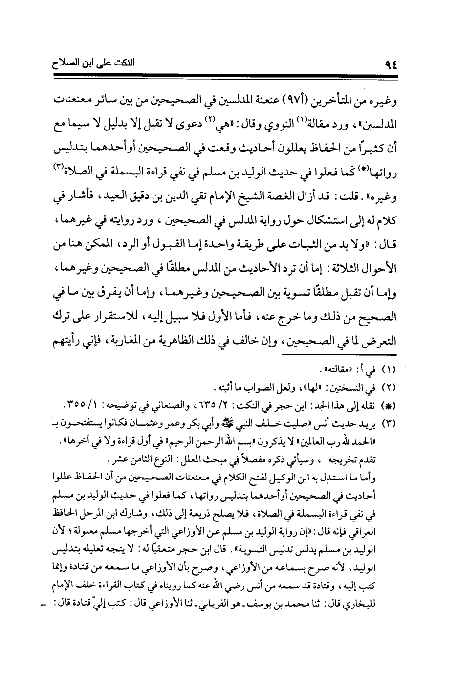 وَغَيره من الْمُتَأَخِّرين (أ 97) عنعنة المدلسين فِي الصَّحِيحَيْنِ من بَين سَائِر معنعنات المدلسين ورد مقَالَة النَّوَوِيّ وَقَالَ هِيَ دَعْوَى لَا تقبل إِلَّا بِدَلِيل لَا سِيمَا مَعَ أَن كثيرا من الْحفاظ يعللون أَحَادِيث وَقعت فِي الصَّحِيحَيْنِ أَو أَحدهمَا بتدليس رواتها كَمَا فعلوا فِي حَدِيث الْوَلِيد بن مُسلم فِي نفي قِرَاءَة الْبَسْمَلَة فِي الصَّلَاة وَغَيره قلت قد أَزَال الغصة الشَّيْخ الإِمَام تَقِيّ الدّين بن دَقِيق الْعِيد فاشار فِي كَلَام لَهُ إِلَى استشكال حول رِوَايَة المدلس فِي الصَّحِيحَيْنِ ورد رِوَايَته فِي غَيرهمَا قَالَ وَلَا بُد من الثَّبَات على طَريقَة وَاحِدَة إِمَّا الْقبُول أَو الرَّد الْمُمكن هُنَا من الْأَحْوَال الثَّلَاثَة إِمَّا أَن ترد الْأَحَادِيث من المدلس مُطلقًا فِي الصَّحِيحَيْنِ وَغَيرهمَا وَإِمَّا أَن تقبل مُطلقًا تَسْوِيَة بَين الصَّحِيحَيْنِ وَغَيرهمَا وَإِمَّا أَن يفرق بَين مَا فِي الصَّحِيح من ذَلِك وَمَا خرج عَنهُ فَأَما الأول فَلَا سَبِيل إِلَيْهِ للاستقرار على ترك التَّعَرُّض لما فِي الصَّحِيحَيْنِ وَإِن خَالف فِي ذَلِك الظَّاهِرِيَّة من المغاربة فَإِنِّي رَأَيْتهمْ