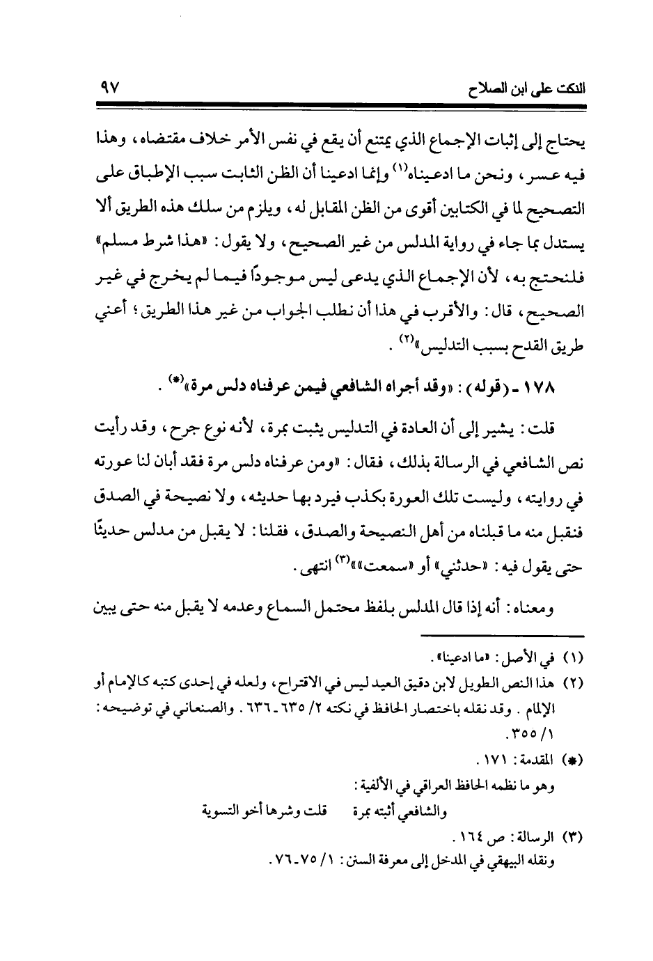 178 - (قَوْله) وَقد أجراه الشَّافِعِي فِيمَن عَرفْنَاهُ دلّس مرّة