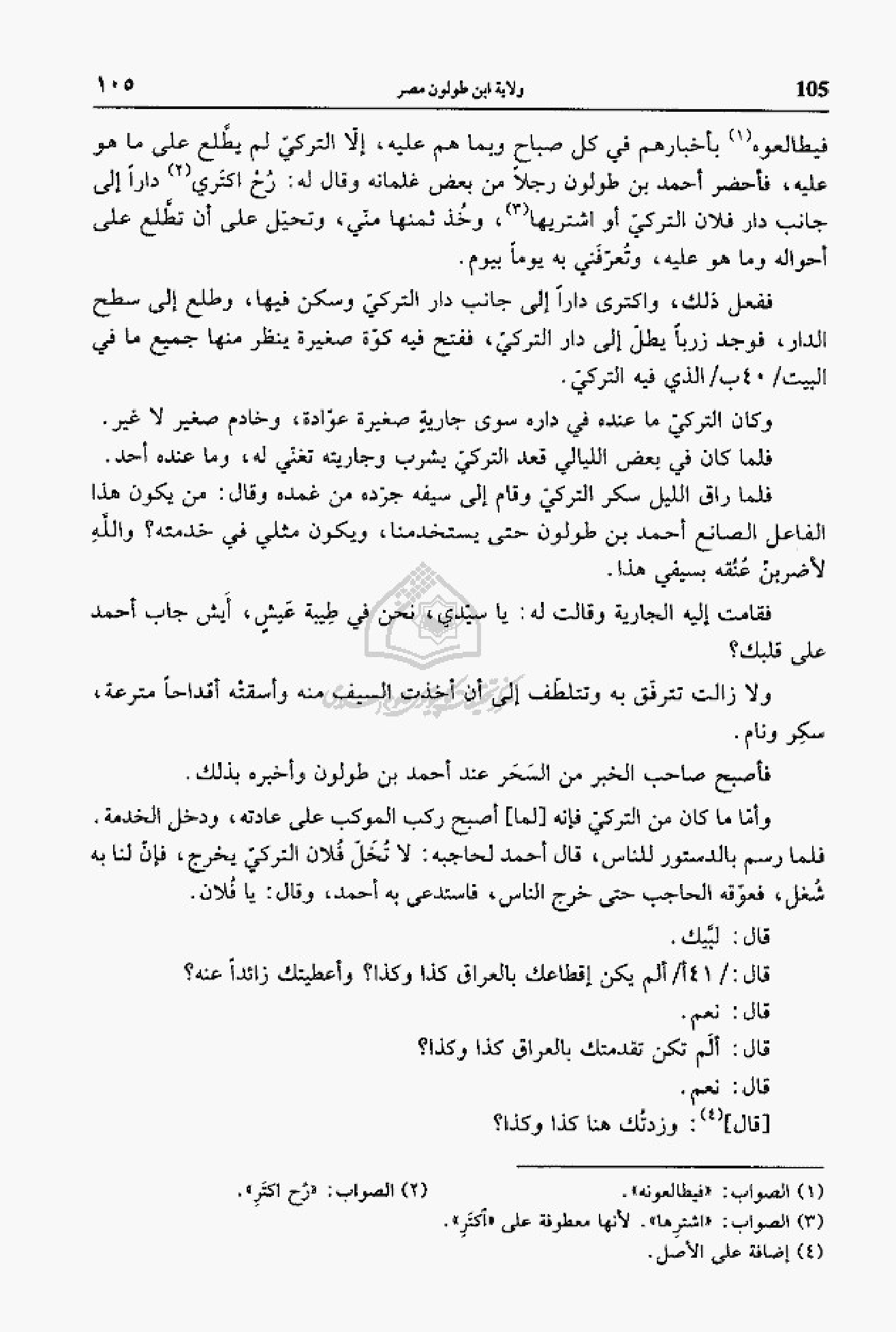فيطالعوه (¬1) بأخبارهم في كل صباح وبما هم عليه، إلاّ التركيّ لم يطّلع على ما هو عليه، فأحضر أحمد بن طولون رجلا من بعض غلمانه وقال له: رح اكتري (¬2) دارا إلى جانب دار فلان التركيّ أو اشتريها (¬3)، وخذ ثمنها منّي، وتحيّل على أن تطّلع على أحواله وما هو عليه، وتعرّفني به يوما بيوم.