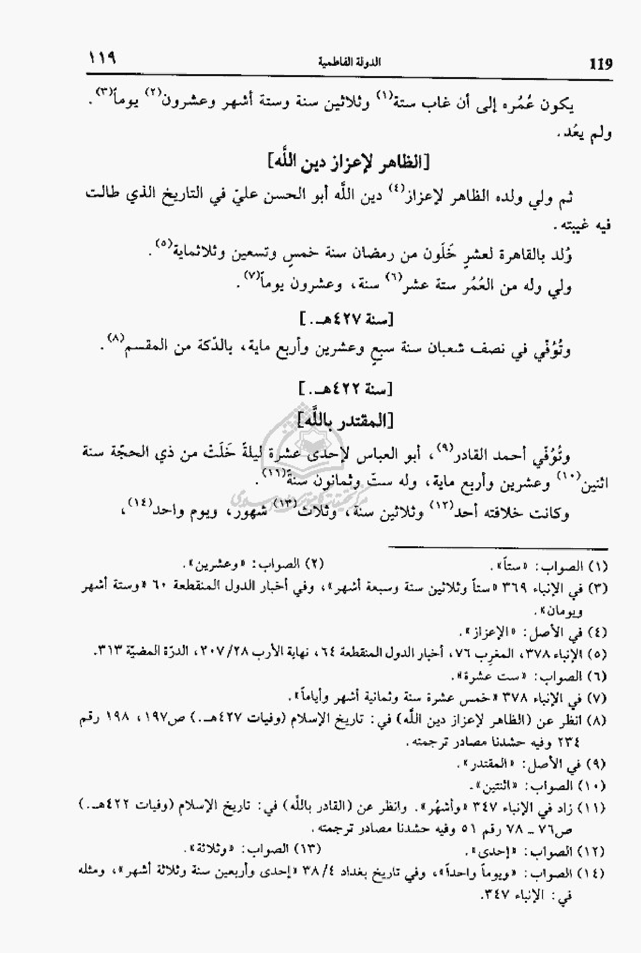 (¬8) انظر عن (الظاهر لإعزاز دين الله) في: تاريخ الإسلام (وفيات 427 هـ). ص 197، 198 رقم 234 وفيه حشدنا مصادر ترجمته.