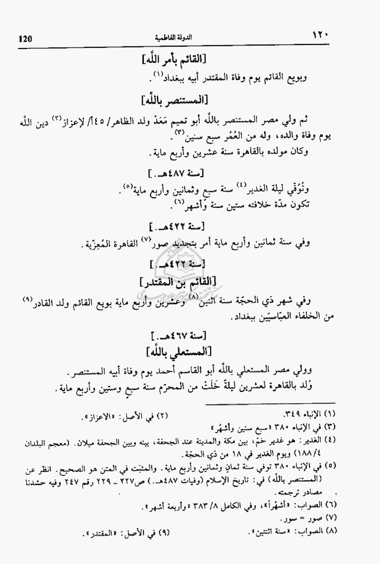 (¬5) في الإنباء 380 توفي سنة ثمان وثمانين وأربع ماية. والمثبت في المتن هو الصحيح. انظر عن (المستنصر بالله) في: تاريخ الإسلام (وفيات 487 هـ). ص 227 - 229 رقم 247 وفيه حشدنا مصادر ترجمته.