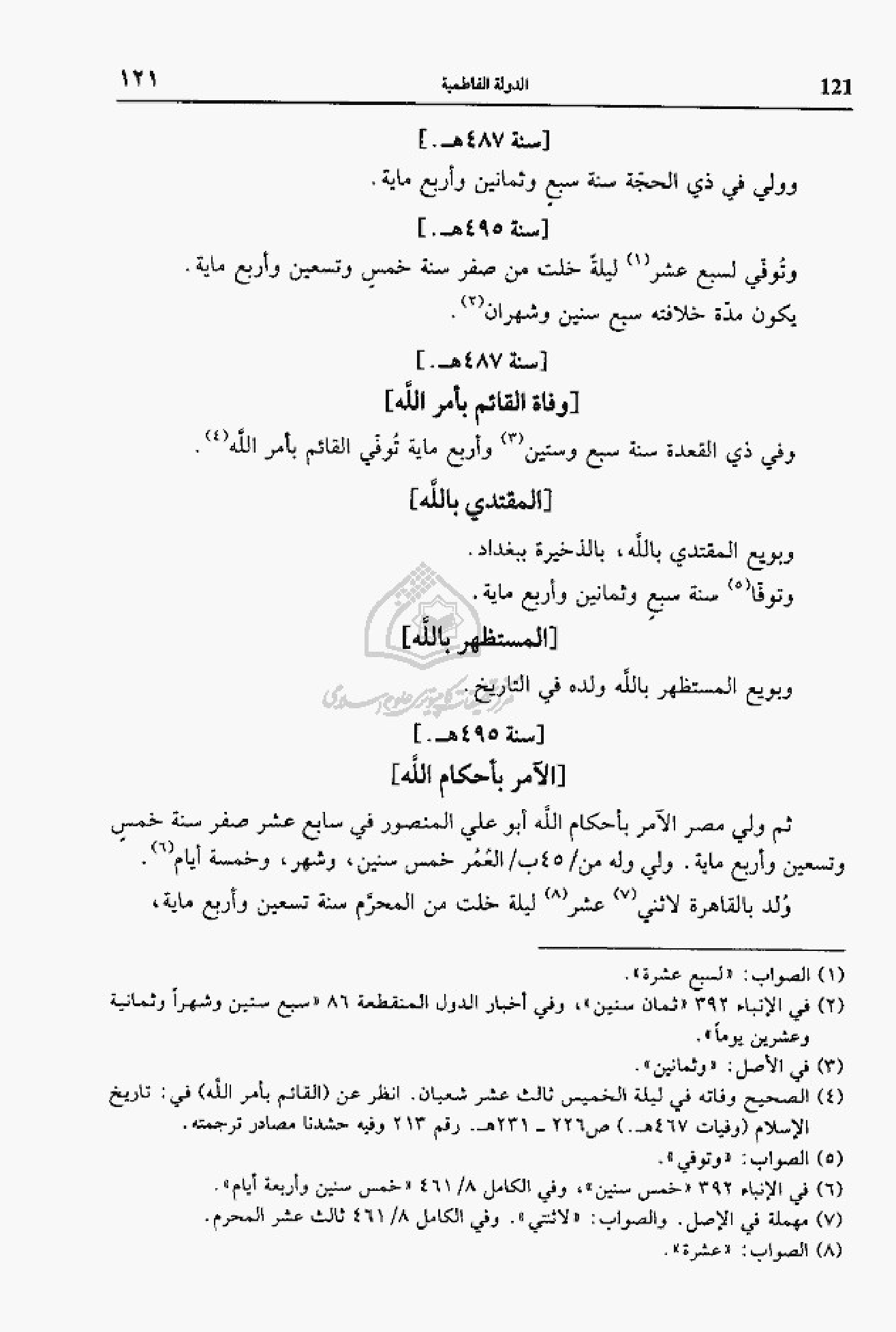 (¬4) الصحيح وفاته في ليلة الخميس ثالث عشر شعبان. انظر عن (القائم بأمر الله) في: تاريخ الإسلام (وفيات 467 هـ). ص 226 - 231 هـ. رقم 213 وفيه حشدنا مصادر ترجمته.