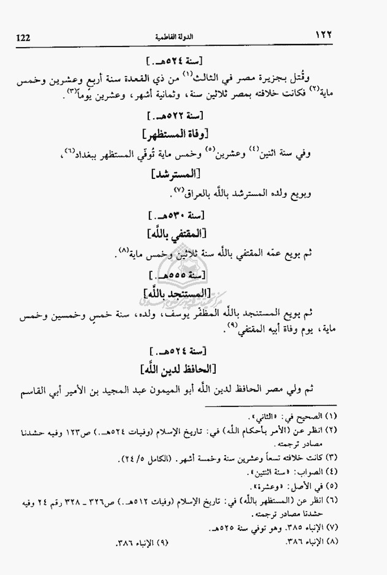(¬6) انظر عن (المستظهر بالله) في: تاريخ الإسلام (وفيات 512 هـ). ص 326 - 328 رقم 24 وفيه حشدنا مصادر ترجمته.