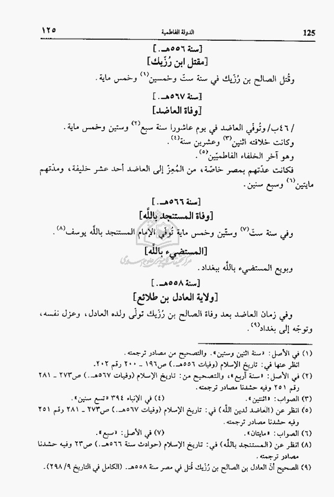 (¬5) انظر عن (العاضد لدين الله) في: تاريخ الإسلام (وفيات 567 هـ). ص 273 - 281 رقم 251 وفيه حشدنا مصادر ترجمته.