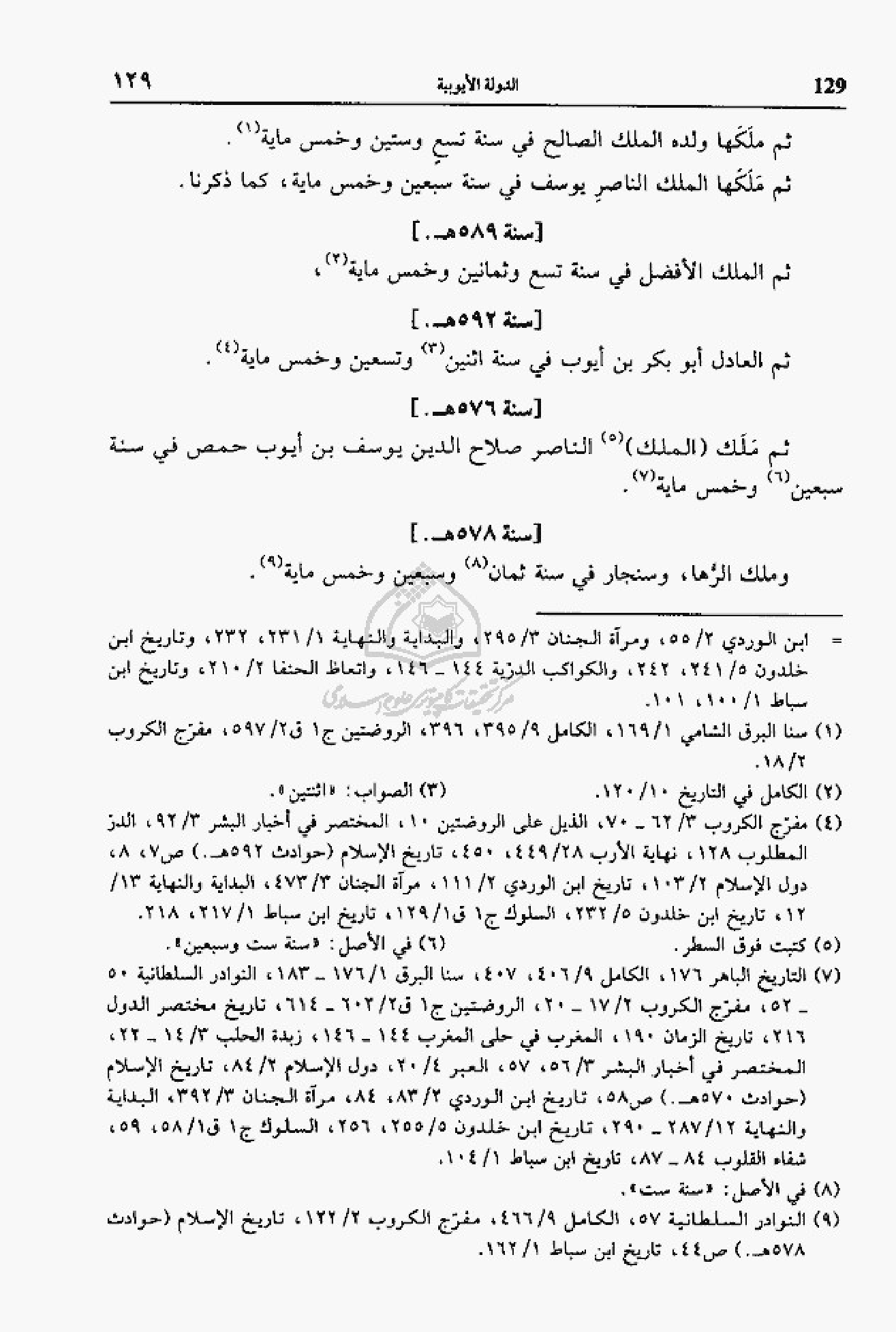 (¬9) النوادر السلطانية 57، الكامل 9/ 466، مفرّج الكروب 2/ 122، تاريخ الإسلام (حوادث 578 هـ). ص 44، تاريخ ابن سباط 1/ 162.