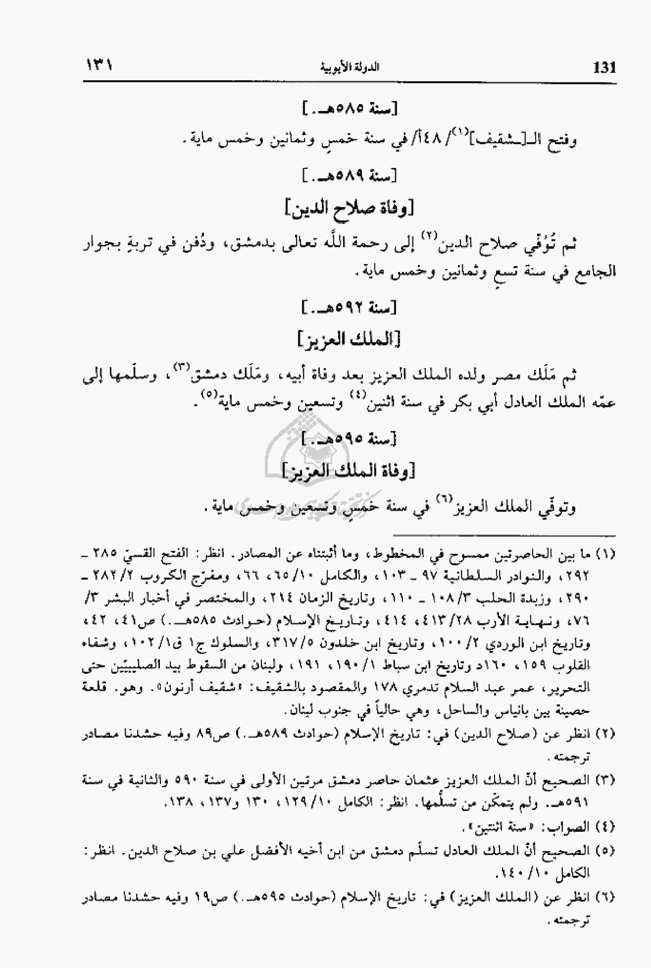(¬3) الصحيح أنّ الملك العزيز عثمان حاصر دمشق مرتين الأولى في سنة 590 والثانية في سنة 591 هـ. ولم يتمكّن من تسلّمها. انظر: الكامل 10/ 129، 130 و 137، 138.