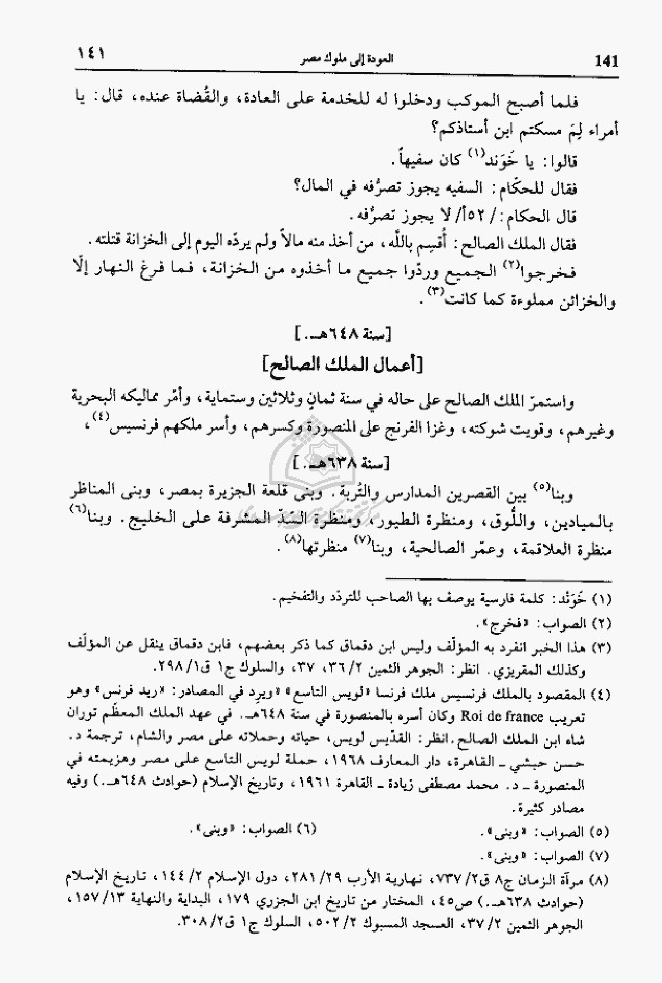 (¬4) المقصود بالملك فرنسيس ملك فرنسا «لويس التاسع» «ويرد في المصادر: «ريد فرنس» وهو تعريب Roi de france وكان أسره بالمنصورة في سنة 648 هـ. في عهد الملك المعظّم توران شاه ابن الملك الصالح. انظر: القدّيس لويس، حياته وحملاته على مصر والشام، ترجمة د. حسن حبشي - القاهرة، دار المعارف 1968، حملة لويس التاسع على مصر وهزيمته في المنصورة - د. محمد مصطفى زيادة - القاهرة 1961، وتاريخ الإسلام (حوادث 648 هـ). وفيه مصادر كثيرة.