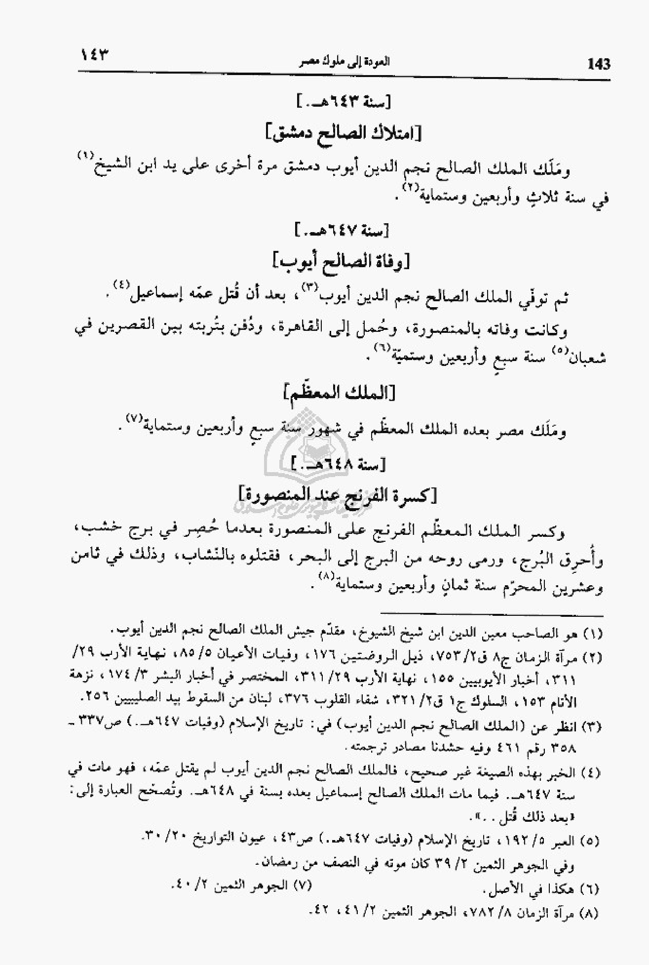 (¬3) انظر عن (الملك الصالح نجم الدين أيوب) في: تاريخ الإسلام (وفيات 647 هـ). ص 337 - 358 رقم 461 وفيه حشدنا مصادر ترجمته.
