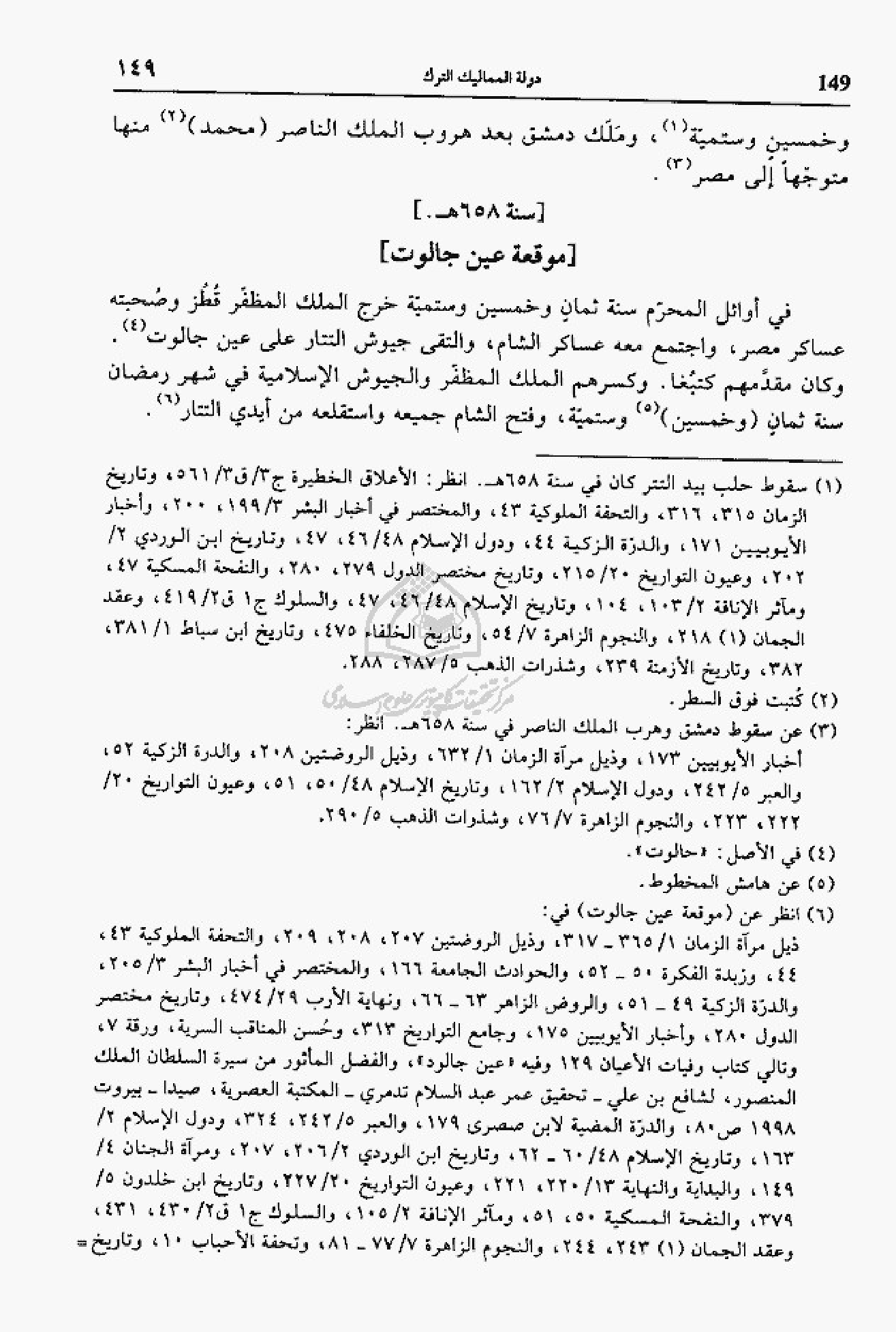 (¬6) انظر عن (موقعة عين جالوت) في: ذيل مرآة الزمان 1/ 365 - 317، وذيل الروضتين 207، 208، 209، والتحفة الملوكية 43، 44، وزبدة الفكرة 50 - 52، والحوادث الجامعة 166، والمختصر في أخبار البشر 3/ 205، والدرّة الزكية 49 - 51، والروض الزاهر 63 - 66، ونهاية الأرب 29/ 474، وتاريخ مختصر الدول 280، وأخبار الأيوبيين 175، وجامع التواريخ 313، وحسن المناقب السرية، ورقة 7، وتالي كتاب وفيات الأعيان 129 وفيه «عين جالود»، والفضل المأثور من سيرة السلطان الملك المنصور، لشافع بن علي - تحقيق عمر عبد السلام تدمري - المكتبة العصرية، صيدا - بيروت 1998 ص 80، والدرّة المضية لابن صصرى 179، والعبر 5/ 242، 324، ودول الإسلام 2/ 163، وتاريخ الإسلام 48/ 60 - 62، وتاريخ ابن الوردي 2/ 206، 207، ومرآة الجنان 4/ 149، والبداية والنهاية 13/ 220، 221، وعيون التواريخ 20/ 227، وتاريخ ابن خلدون 5/ 379، والنفحة المسكية 50، 51، ومآثر الإنافة 2/ 105، والسلوك ج 1 ق 2/ 430، 431، وعقد الجمان (1) 243، 244، والنجوم الزاهرة 7/ 77 - 81، وتحفة الأحباب 10، وتاريخ =