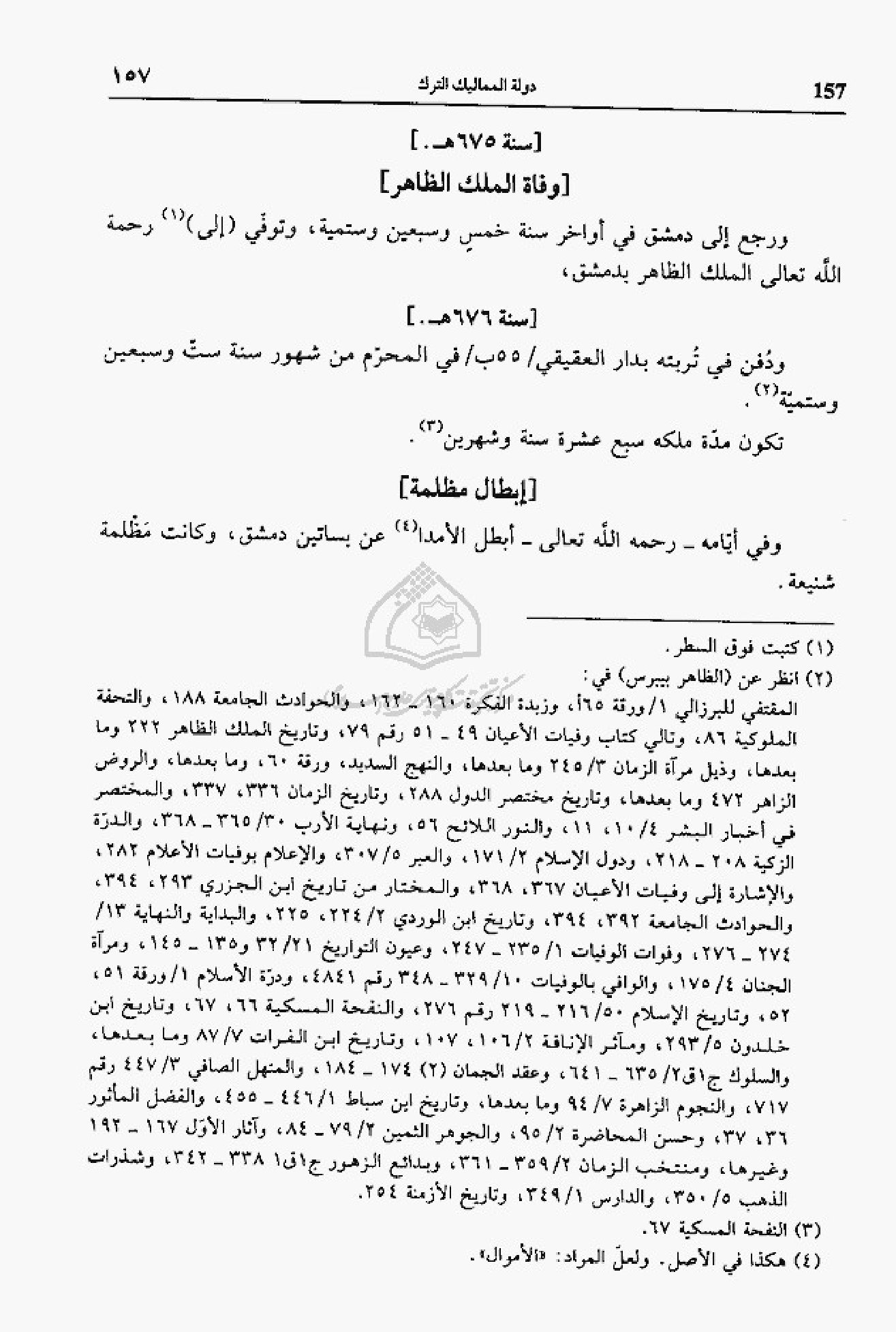 (¬2) انظر عن (الظاهر بيبرس) في: المقتفي للبرزالي 1 / ورقة 65 أ، وزبدة الفكرة 160 - 162، والحوادث الجامعة 188، والتحفة الملوكية 86، وتالي كتاب وفيات الأعيان 49 - 51 رقم 79، وتاريخ الملك الظاهر 222 وما بعدها، وذيل مرآة الزمان 3/ 245 وما بعدها، والنهج السديد، ورقة 60، وما بعدها، والروض الزاهر 472 وما بعدها، وتاريخ مختصر الدول 288، وتاريخ الزمان 336، 337، والمختصر في أخبار البشر 4/ 10، 11، والنور اللائح 56، ونهاية الأرب 30/ 365 - 368، والدرّة الزكية 208 - 218، ودول الإسلام 2/ 171، والعبر 5/ 307، والإعلام بوفيات الأعلام 282، والإشارة إلى وفيات الأعيان 367، 368، والمختار من تاريخ ابن الجزري 293، 394، والحوادث الجامعة 392، 394، وتاريخ ابن الوردي 2/ 224، 225، والبداية والنهاية 13/ 274 - 276، وفوات الوفيات 1/ 235 - 247، وعيون التواريخ 21/ 32 و 135 - 145، ومرآة الجنان 4/ 175، والوافي بالوفيات 10/ 329 - 348 رقم 4841، ودرّة الأسلام 1 / ورقة 51، 52، وتاريخ الإسلام 50/ 216 - 219 رقم 276، والنفحة المسكية 66، 67، وتاريخ ابن خلدون 5/ 293، ومآثر الإنافة 2/ 106، 107، وتاريخ ابن الفرات 7/ 87 وما بعدها، والسلوك ج 1 ق 2/ 635 - 641، وعقد الجمان (2) 174 - 184، والمنهل الصافي 3/ 447 رقم 717، والنجوم الزاهرة 7/ 94 وما بعدها، وتاريخ ابن سباط 1/ 446 - 455، والفضل المأثور 36، 37، وحسن المحاضرة 2/ 95، والجوهر الثمين 2/ 79 - 84، وآثار الأول 167 - 192 وغيرها، ومنتخب الزمان 2/ 359 - 361، وبدائع الزهور ج 1 ق 1/ 338 - 342، وشذرات الذهب 5/ 350، والدارس 1/ 349، وتاريخ الأزمنة 254.