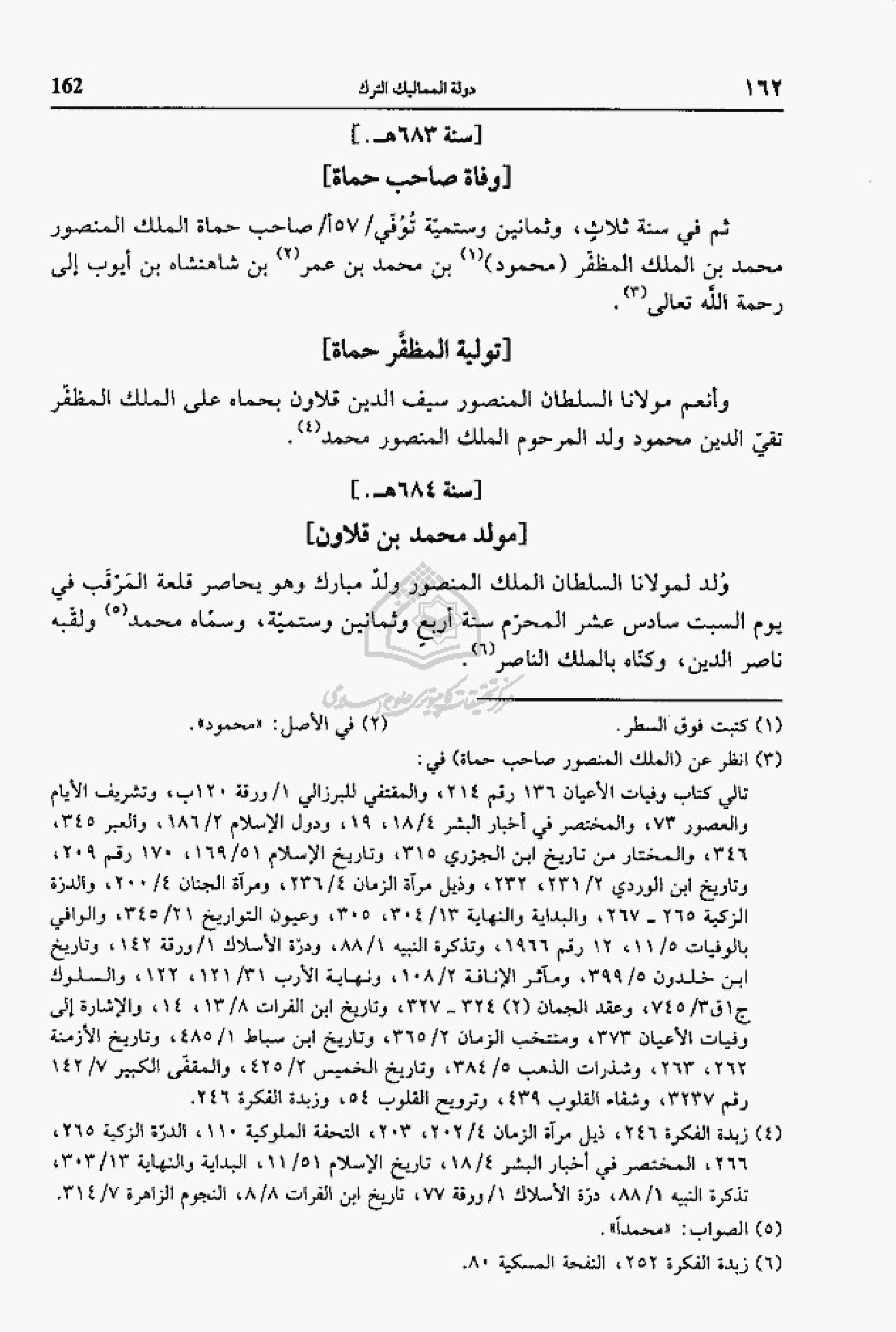 (¬3) انظر عن (الملك المنصور صاحب حماة) في: تالي كتاب وفيات الأعيان 136 رقم 214، والمقتفي للبرزالي 1 / ورقة 120 ب، وتشريف الأيام والعصور 73، والمختصر في أخبار البشر 4/ 18، 19، ودول الإسلام 2/ 186، والعبر 345، 346، والمختار من تاريخ ابن الجزري 315، وتاريخ الإسلام 51/ 169، 170 رقم 209، وتاريخ ابن الوردي 2/ 231، 232، وذيل مرآة الزمان 4/ 236، ومرآة الجنان 4/ 200، والدرّة الزكية 265 - 267، والبداية والنهاية 13/ 304، 305، وعيون التواريخ 21/ 345، والوافي بالوفيات 5/ 11، 12 رقم 1966، وتذكرة النبيه 1/ 88، ودرّة الأسلاك 1 / ورقة 142، وتاريخ ابن خلدون 5/ 399، ومآثر الإنافة 2/ 108، ونهاية الأرب 31/ 121، 122، والسلوك ج 1 ق 3/ 745، وعقد الجمان (2) 324 - 327، وتاريخ ابن الفرات 8/ 13، 14، والإشارة إلى وفيات الأعيان 373، ومنتخب الزمان 2/ 365، وتاريخ ابن سباط 1/ 485، وتاريخ الأزمنة 262، 263، وشذرات الذهب 5/ 384، وتاريخ الخميس 2/ 425، والمقفّى الكبير 7/ 142 رقم 3237، وشفاء القلوب 439، وترويح القلوب 54، وزبدة الفكرة 246.