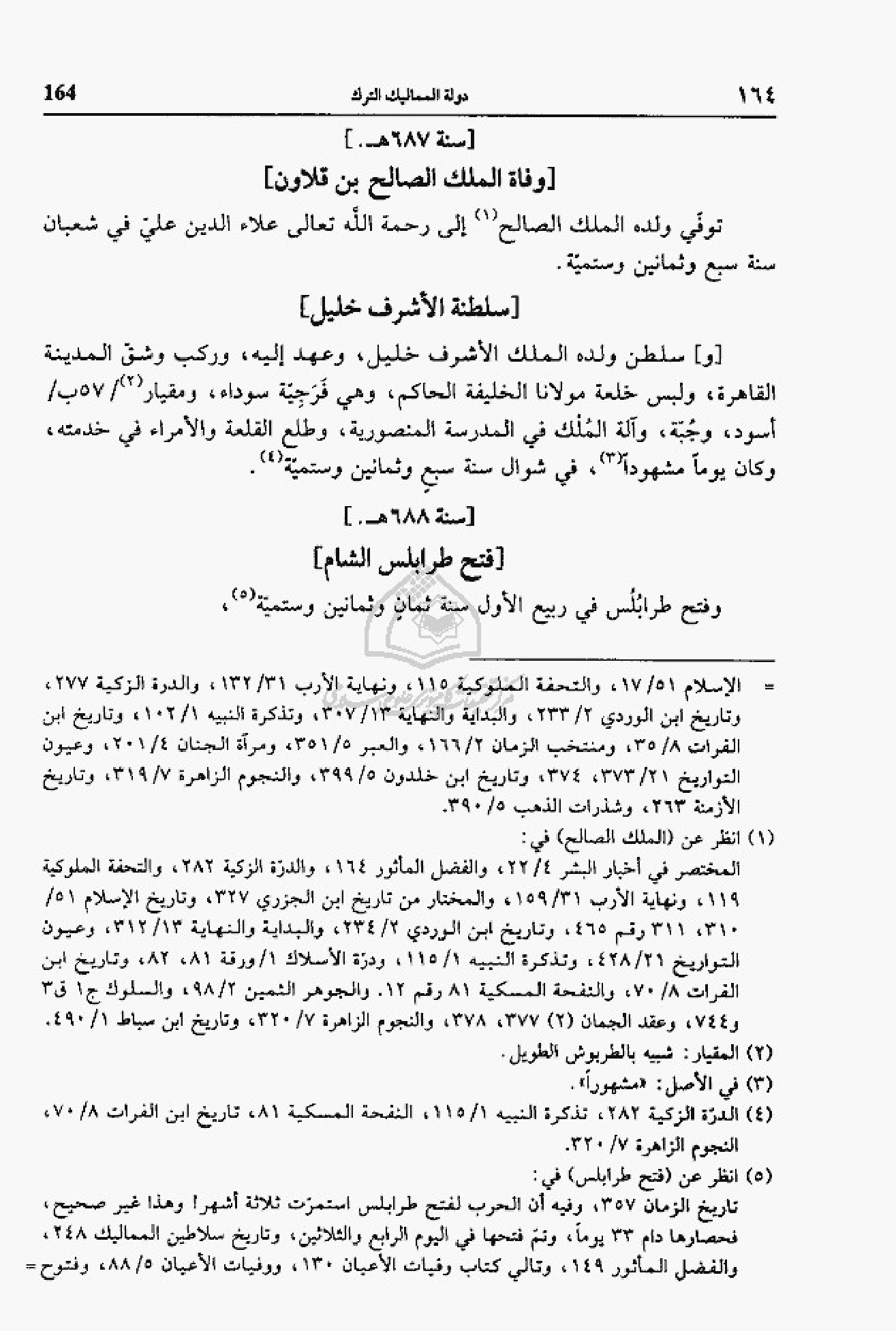 (¬5) انظر عن (فتح طرابلس) في: تاريخ الزمان 357، وفيه أن الحرب لفتح طرابلس استمرّت ثلاثة أشهر! وهذا غير صحيح، فحصارها دام 33 يوما، وتمّ فتحها في اليوم الرابع والثلاثين، وتاريخ سلاطين المماليك 248، والفضل المأثور 149، وتالي كتاب وفيات الأعيان 130، ووفيات الأعيان 5/ 88، وفتوح =