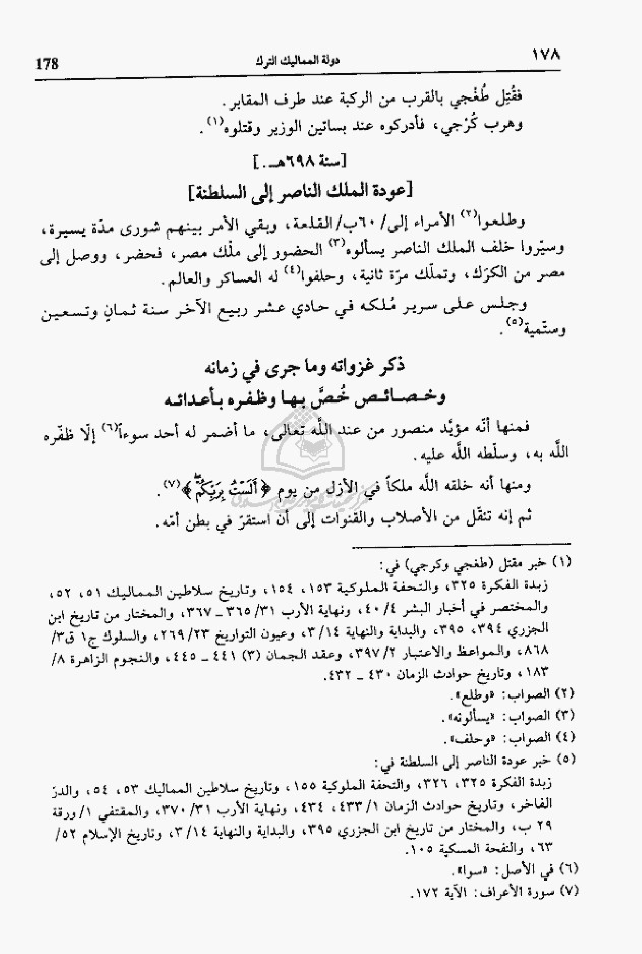 (¬5) خبر عودة الناصر إلى السلطنة في: زبدة الفكرة 325، 326، والتحفة الملوكية 155، وتاريخ سلاطين المماليك 53، 54، والدرّ الفاخر، وتاريخ حوادث الزمان 1/ 433، 434، ونهاية الأرب 31/ 370، والمقتفي 1 / ورقة 29 ب، والمختار من تاريخ ابن الجزري 395، والبداية والنهاية 14/ 3، وتاريخ الإسلام 52/ 63، والنفحة المسكية 105.