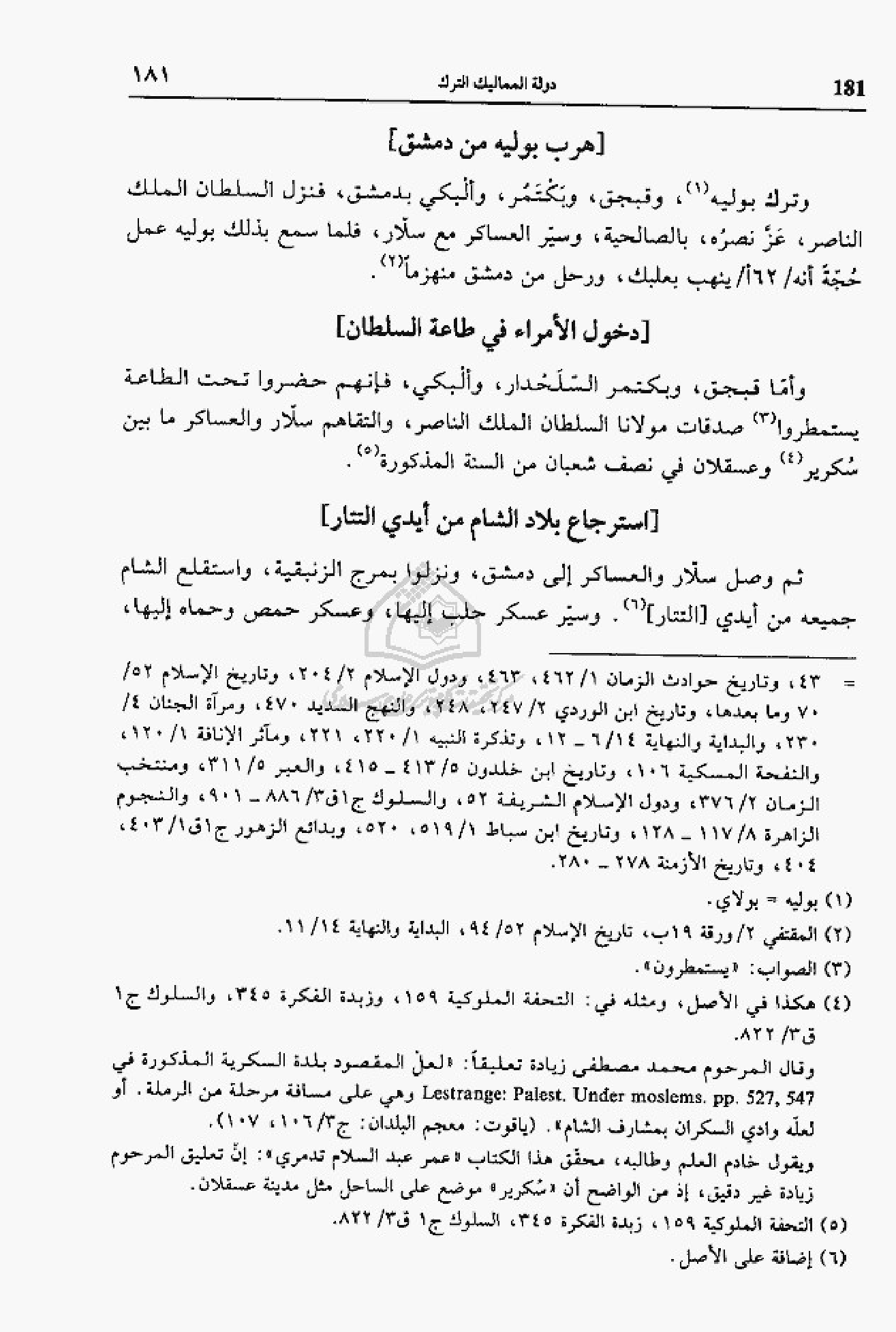 (¬4) هكذا في الأصل، ومثله في: التحفة الملوكية 159، وزبدة الفكرة 345، والسلوك ج 1 ق 3/ 822. وقال المرحوم محمد مصطفى زيادة تعليقا: «لعلّ المقصود بلدة السكرية المذكورة في Lestrange:Palest.Under moslems.pp.527,547 وهي على مسافة مرحلة من الرملة. أو لعلّه وادي السكران بمشارف الشام». (ياقوت: معجم البلدان: ج 3/ 106، 107). ويقول خادم العلم وطالبه، محقّق هذا الكتاب «عمر عبد السلام تدمري»: إنّ تعليق المرحوم زيادة غير دقيق، إذ من الواضح أن «سكرير» موضع على الساحل مثل مدينة عسقلان.