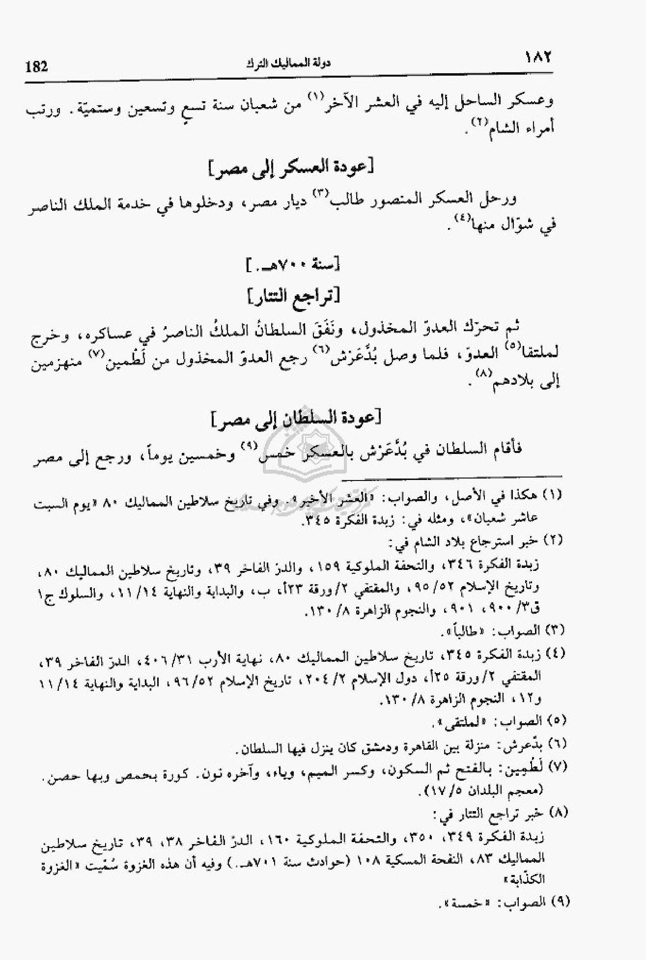 (¬8) خبر تراجع التتار في: زبدة الفكرة 349، 350، والتحفة الملوكية 160، الدرّ الفاخر 38، 39، تاريخ سلاطين المماليك 83، النفحة المسكية 108 (حوادث سنة 701 هـ). وفيه أن هذه الغزوة سمّيت «الغزوة الكذّابة».