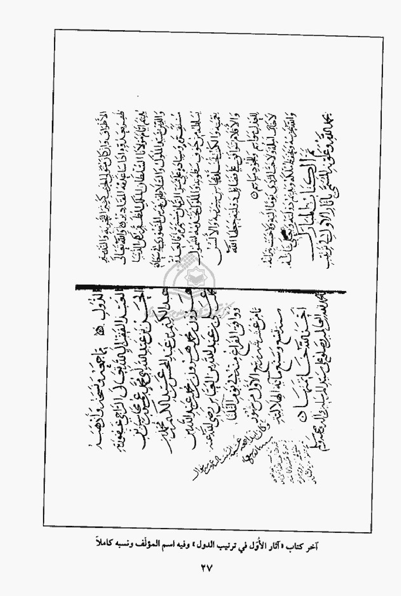آخر كتاب «آثار الأول في ترتيب الدول» وفيه اسم المؤلّف ونسبه كاملا