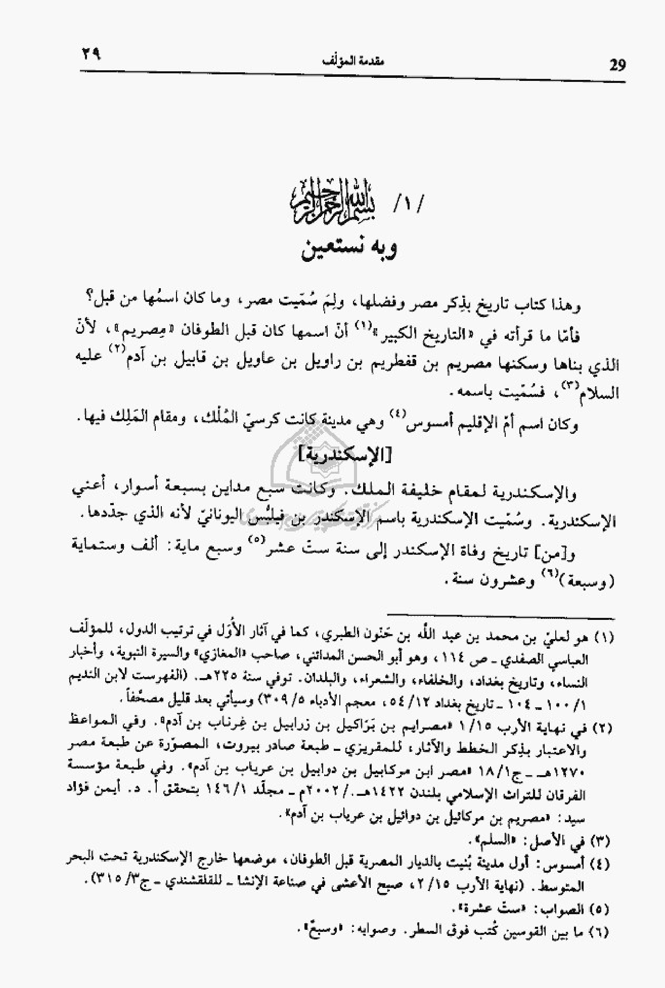 (¬2) في نهاية الأرب 15/ 1 «مصرايم بن براكيل بن زرابيل بن غرناب بن آدم». وفي المواعظ والاعتبار بذكر الخطط والآثار، للمقريزي - طبعة صادر بيروت، المصوّرة عن طبعة مصر 1270 هـ - ج 1/ 18 «مصر ابن مركابيل بن دوابيل بن عرياب بن آدم». وفي طبعة مؤسسة الفرقان للتراث الإسلامي بلندن 1422 هـ. / 2002 م - مجلّد 1/ 146 بتحقق أ. د. أيمن فؤاد سيد: «مصريم بن مركائيل بن دوائيل بن عرياب بن آدم».