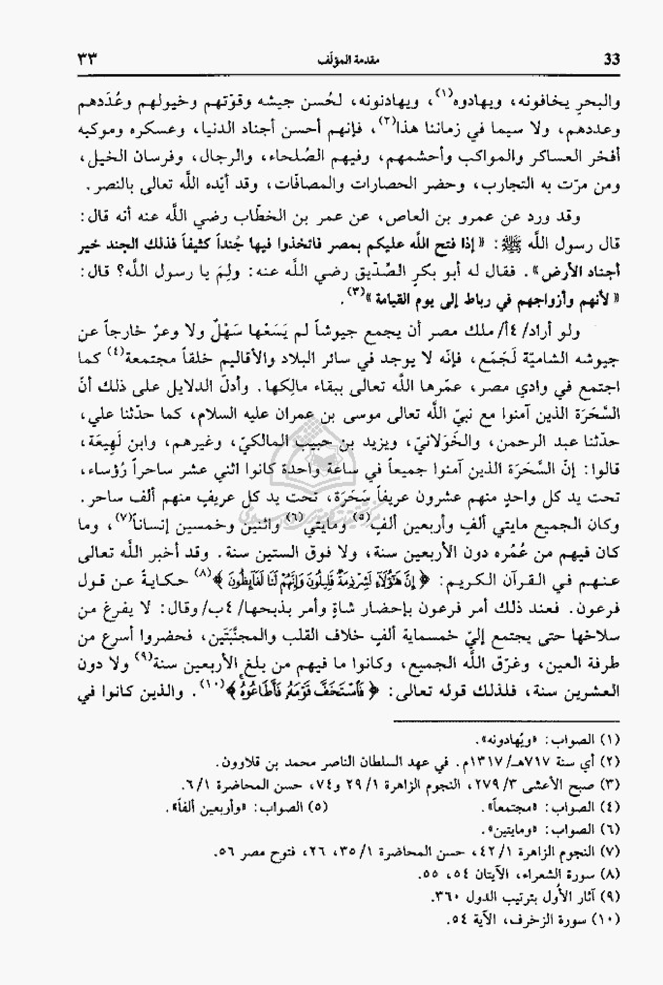 ولو أراد ملك مصر أن يجمع جيوشا لم يسعها سهل ولا وعر خارجا عن جيوشه الشاميّة لجمع، فإنّه لا يوجد في سائر البلاد والأقاليم خلقا مجتمعة (¬4) كما اجتمع في وادي مصر، عمّرها الله تعالى ببقاء مالكها. وأدلّ الدلايل على ذلك أنّ السّحرة الذين آمنوا مع نبيّ الله تعالى موسى بن عمران عليه السلام، كما حدّثنا علي، حدّثنا عبد الرحمن، والخولانيّ، ويزيد بن حبيب المالكيّ، وغيرهم، وابن لهيعة، قالوا: إنّ السّحرة الذين آمنوا جميعا في ساعة واحدة كانوا اثني عشر ساحرا رؤساء، تحت يد كل واحد منهم عشرون عريفا سحرة، تحت يد كل عريف منهم ألف ساحر.