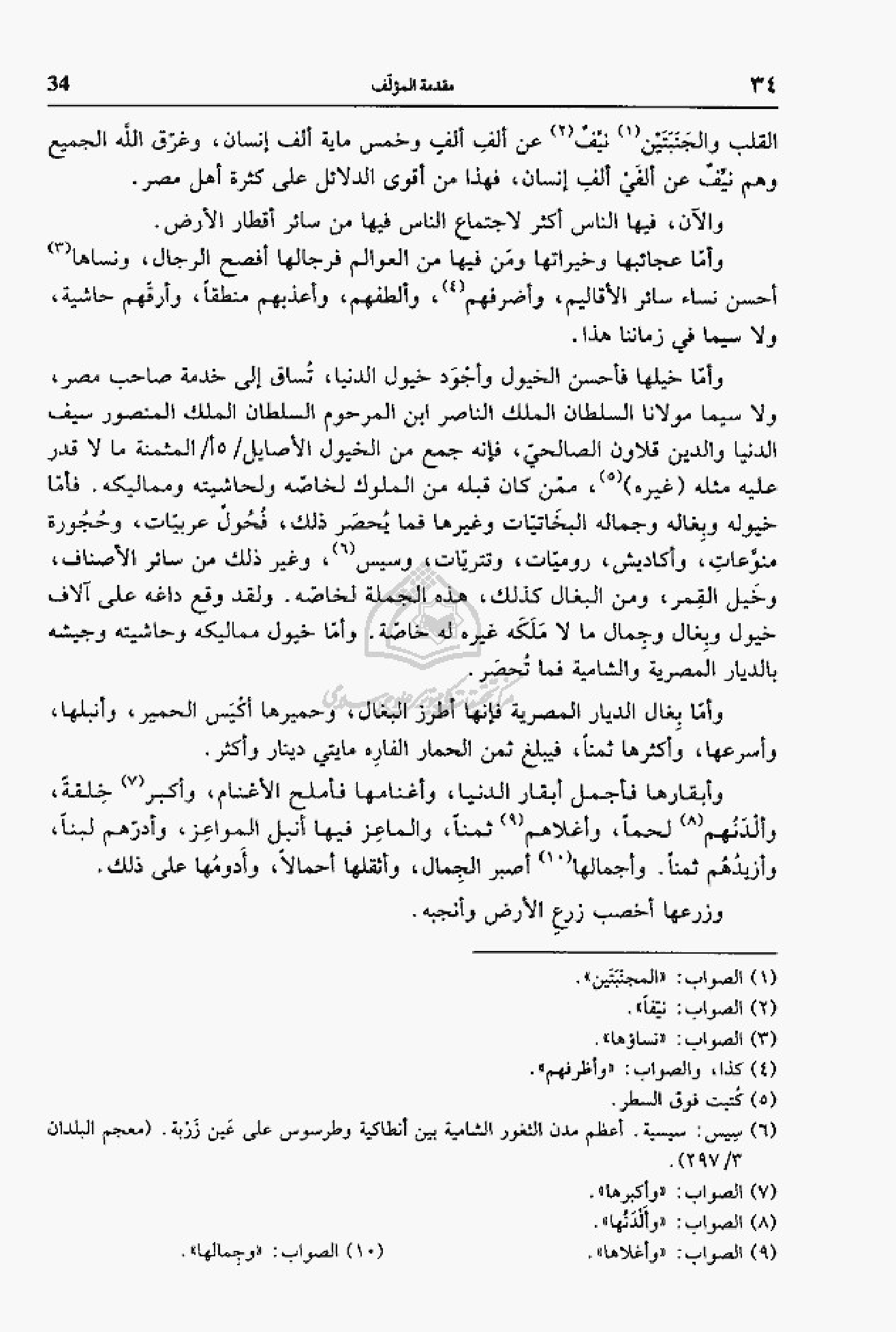 وأمّا خيلها فأحسن الخيول وأجود خيول الدنيا، تساق إلى خدمة صاحب مصر، ولا سيما مولانا السلطان الملك الناصر ابن المرحوم السلطان الملك المنصور سيف الدنيا والدين قلاون الصالحيّ، فإنه جمع من الخيول الأصايل المثمنة ما لا قدر عليه مثله (غيره) (¬5)، ممّن كان قبله من الملوك لخاصّه ولحاشيته ومماليكه. فأمّا خيوله وبغاله وجماله البخاتيّات وغيرها فما يحصر ذلك، فحول عربيّات، وحجورة منوّعات، وأكاديش، روميّات، وتتريّات، وسيس (¬6)، وغير ذلك من سائر الأصناف، وخيل القمر، ومن البغال كذلك، هذه الجملة لخاصّه. ولقد وقع داغه على آلاف خيول وبغال وجمال ما لا ملكه غيره له خاصّة. وأمّا خيول مماليكه وحاشيته وجيشه بالديار المصرية والشامية فما تحصر.