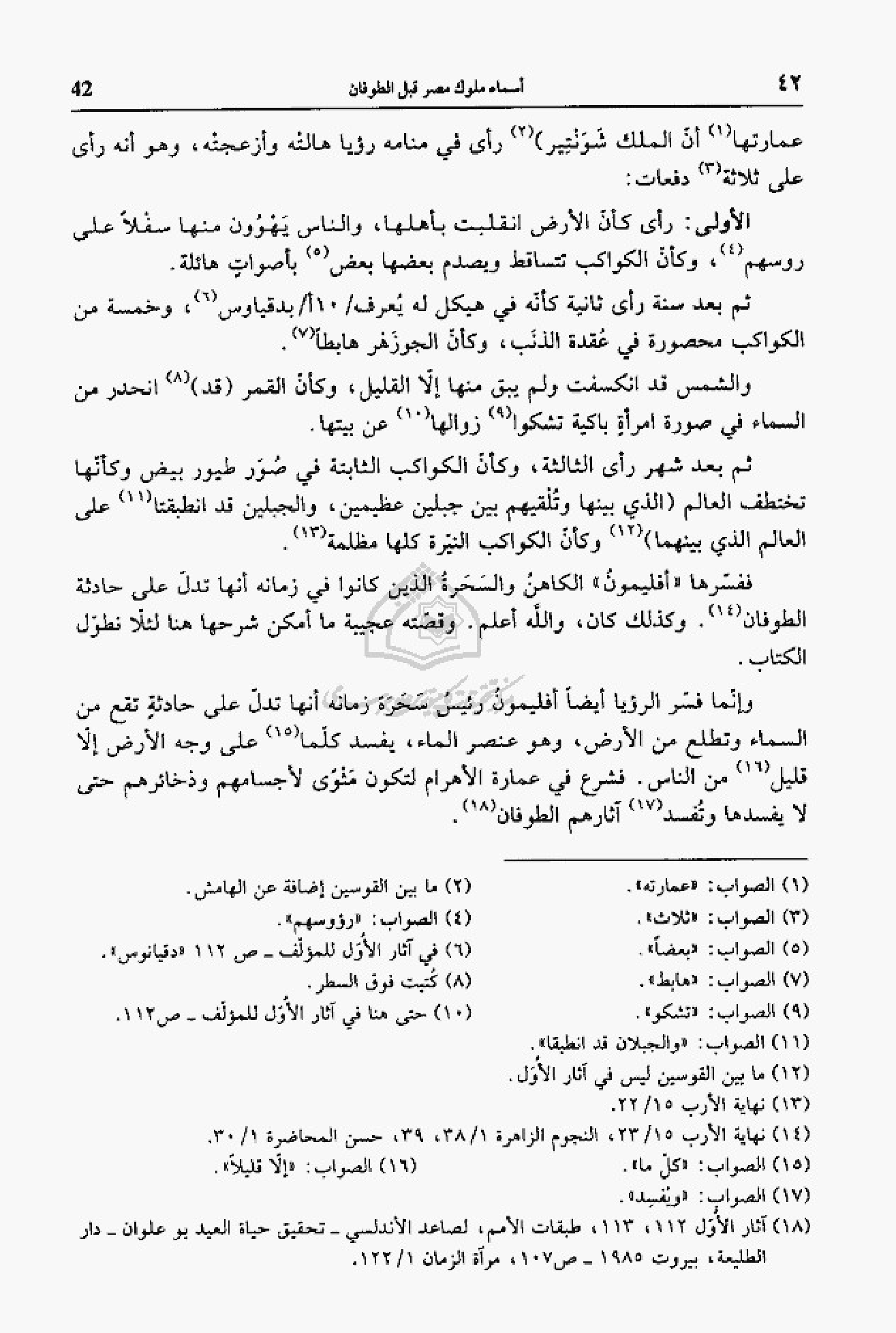 وإنّما فسّر الرؤيا أيضا أفليمون رئيس سحرة زمانه أنها تدلّ على حادثة تقع من السماء وتطلع من الأرض، وهو عنصر الماء، يفسد كلّما (¬15) على وجه الأرض إلاّ قليل (¬16) من الناس. فشرع في عمارة الأهرام لتكون مثوى لأجسامهم وذخائرهم حتى لا يفسدها وتفسد (¬17) آثارهم الطوفان (¬18).