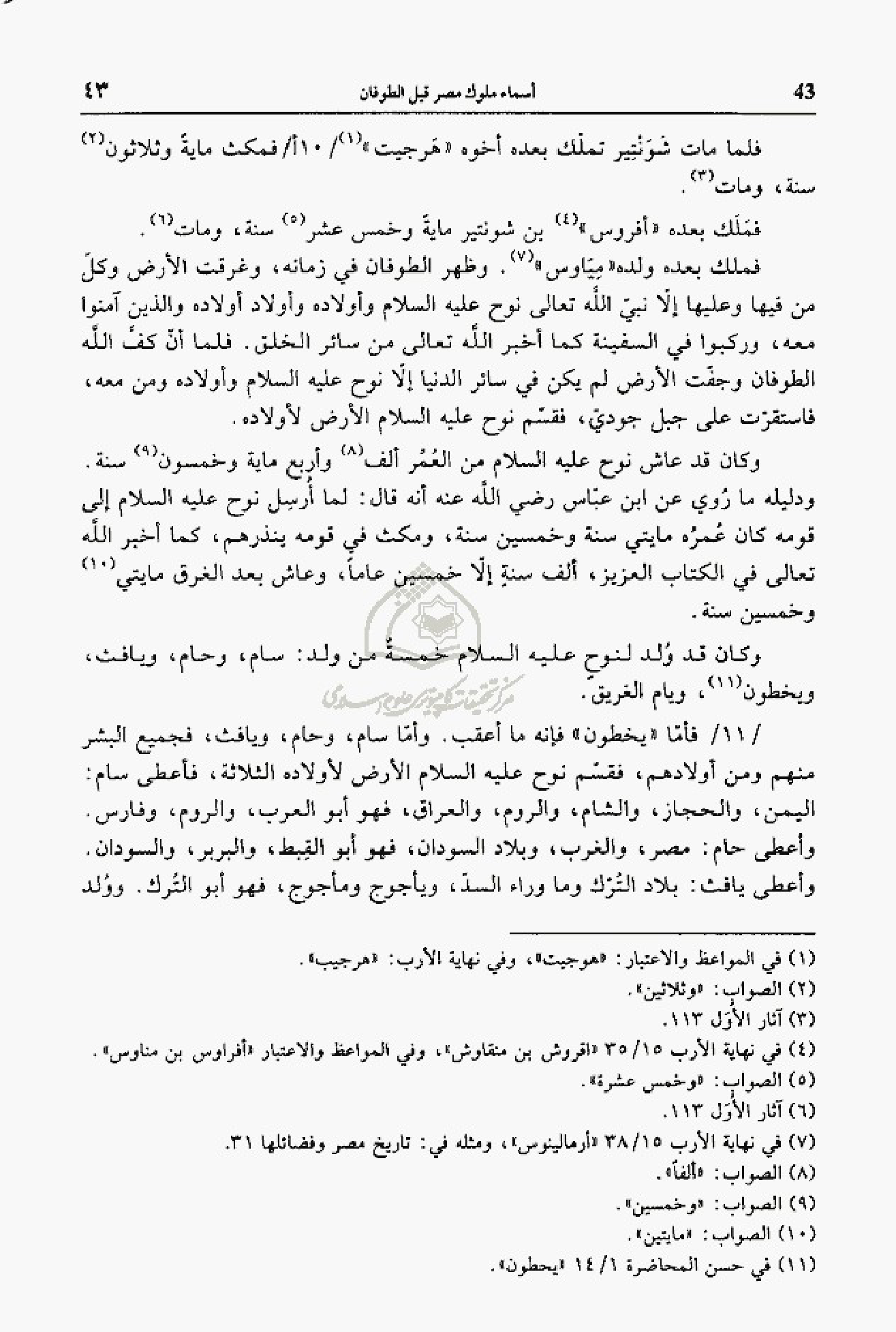 فملك بعده ولده «مياوس» (¬7). وظهر الطوفان في زمانه، وغرقت الأرض وكلّ من فيها وعليها إلاّ نبيّ الله تعالى نوح عليه السلام وأولاده وأولاد أولاده والذين آمنوا معه، وركبوا في السفينة كما أخبر الله تعالى من سائر الخلق. فلما أنّ كفّ الله الطوفان وجفّت الأرض لم يكن في سائر الدنيا إلاّ نوح عليه السلام وأولاده ومن معه، فاستقرّت على جبل جوديّ، فقسّم نوح عليه السلام الأرض لأولاده.