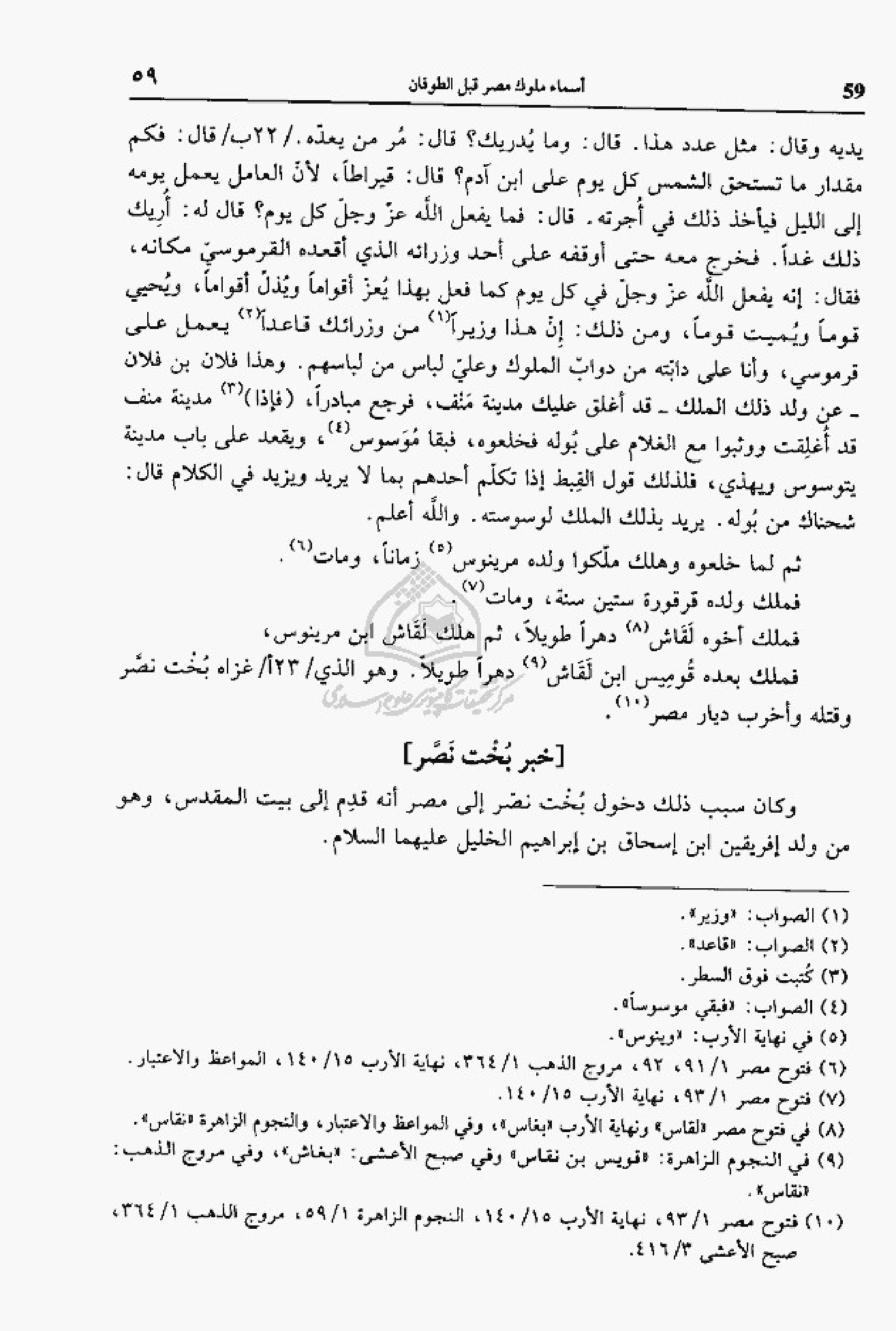يديه وقال: مثل عدد هذا. قال: وما يدريك؟ قال: مر من يعدّه. قال: فكم مقدار ما تستحق الشمس كل يوم على ابن آدم؟ قال: قيراطا، لأنّ العامل يعمل يومه إلى الليل فيأخذ ذلك في أجرته. قال: فما يفعل الله عزّ وجلّ كل يوم؟ قال له: أريك ذلك غدا. فخرج معه حتى أوقفه على أحد وزرائه الذي أقعده القرموسيّ مكانه، فقال: إنه يفعل الله عزّ وجلّ في كل يوم كما فعل بهذا يعزّ أقواما ويذلّ أقواما، ويحيي قوما ويميت قوما، ومن ذلك: إنّ هذا وزيرا (¬1) من وزرائك قاعدا (¬2) يعمل على قرموسي، وأنا على دابّته من دوابّ الملوك وعليّ لباس من لباسهم. وهذا فلان بن فلان - عن ولد ذلك الملك - قد أغلق عليك مدينة منف، فرجع مبادرا، (فإذا) (¬3) مدينة منف قد أغلقت ووثبوا مع الغلام على بوله فخلعوه، فبقا موسوس (¬4)، ويقعد على باب مدينة يتوسوس ويهذي، فلذلك قول القبط إذا تكلّم أحدهم بما لا يريد ويزيد في الكلام قال: