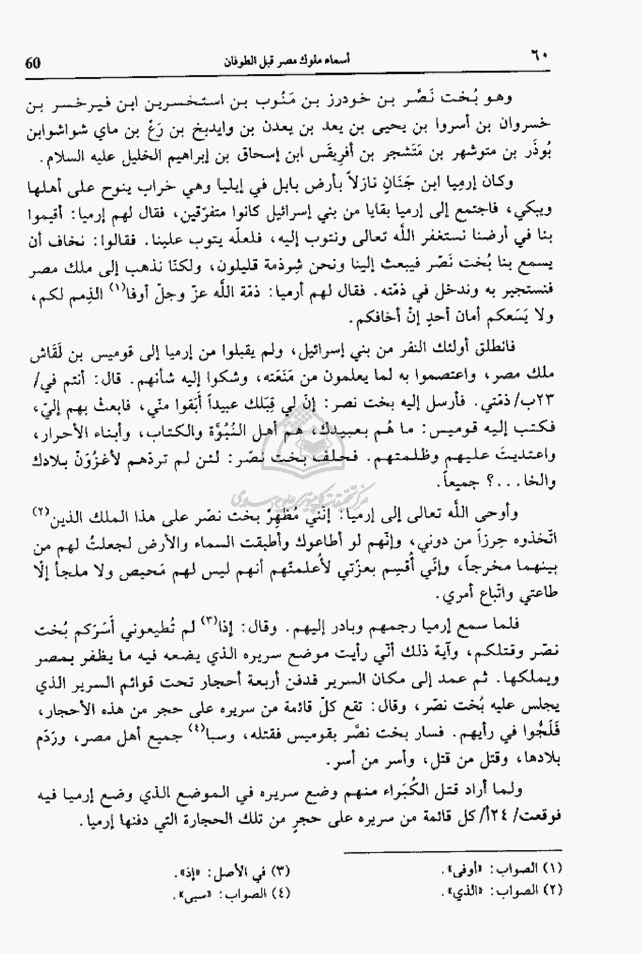 فانطلق أولئك النفر من بني إسرائيل، ولم يقبلوا من إرميا إلى قوميس بن لقاش ملك مصر، واعتصموا به لما يعلمون من منعته، وشكوا إليه شأنهم. قال: أنتم في ذمّتي. فأرسل إليه بخت نصر: إنّ لي قبلك عبيدا أبقوا منّي، فابعث بهم إليّ، فكتب إليه قوميس: ما هم بعبيدك، هم أهل النبوّة والكتاب، وأبناء الأحرار، واعتديت عليهم وظلمتهم. فحلف بخت نصّر: لئن لم تردّهم لأغزونّ بلادك والخا. . .؟ جميعا.