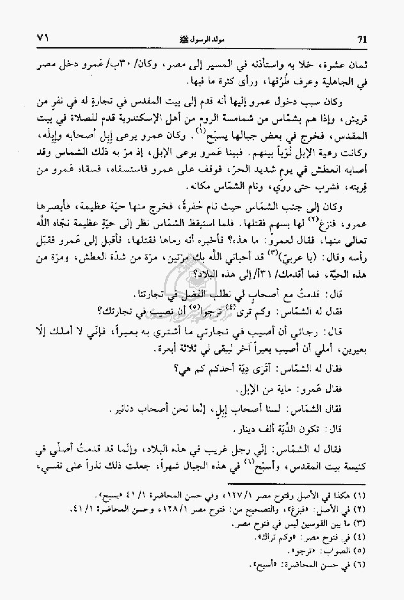 وكان إلى جنب الشمّاس حيث نام حفرة، فخرج منها حيّة عظيمة، فأبصرها عمرو، فنزغ (¬2) لها بسهم فقتلها. فلما استيقظ الشمّاس نظر إلى حيّة عظيمة نجّاه الله تعالى منها، فقال لعمرو: ما هذه؟ فأخبره أنه رماها فقتلها، فأقبل إلى عمرو فقبّل رأسه وقال: (يا عربيّ) (¬3) قد أحياني الله بك مرّتين، مرّة من شدّة العطش، ومرّة من هذه الحيّة، فما أقدمك إلى هذه البلاد؟