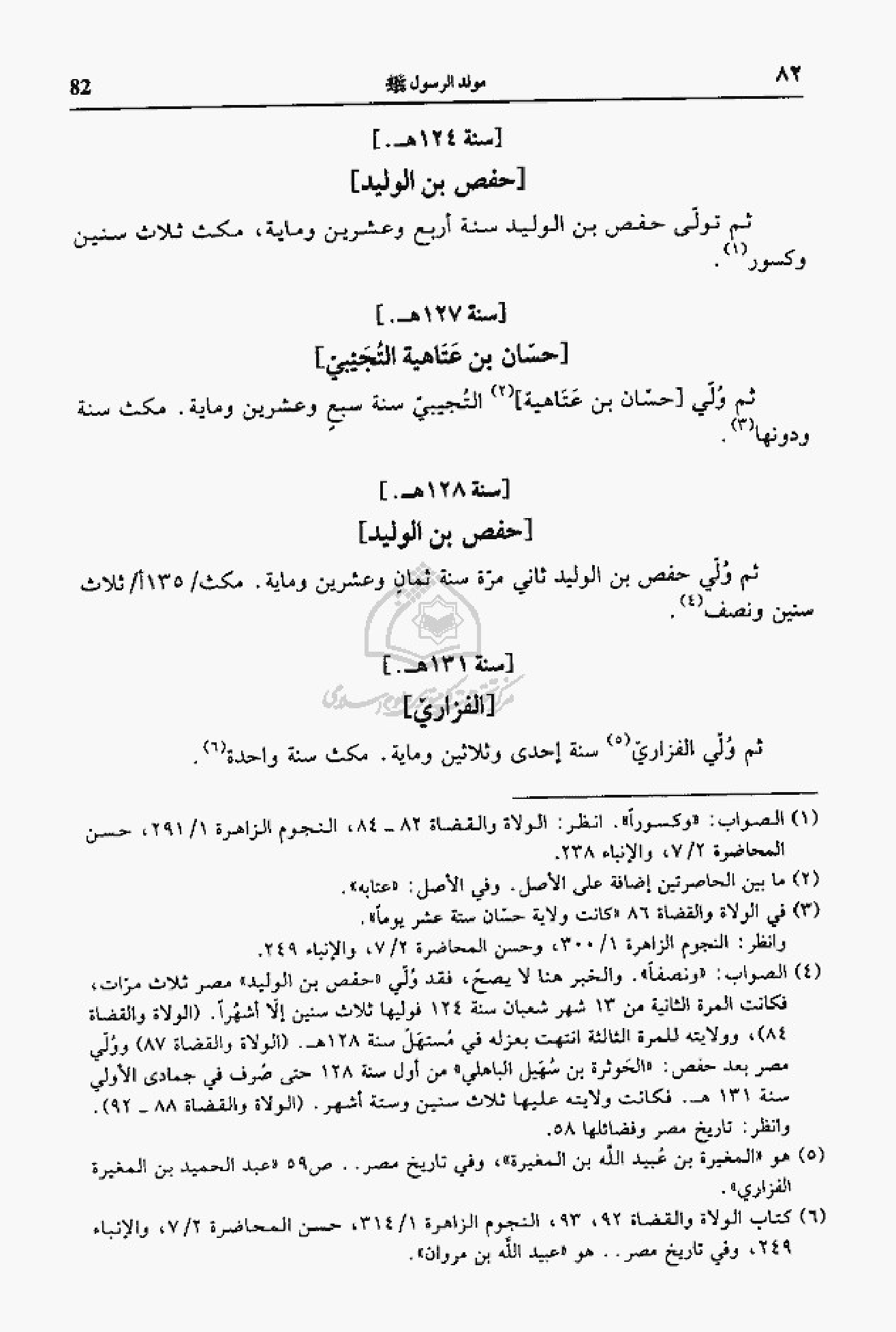 (¬4) الصواب: «ونصفا». والخبر هنا لا يصحّ، فقد ولّي «حفص بن الوليد» مصر ثلاث مرّات، فكانت المرة الثانية من 13 شهر شعبان سنة 124 فوليها ثلاث سنين إلاّ أشهرا. (الولاة والقضاة 84)، وولايته للمرة الثالثة انتهت بعزله في مستهلّ سنة 128 هـ. (الولاة والقضاة 87) وولّي مصر بعد حفص: «الحوثرة بن سهيل الباهلي» من أول سنة 128 حتى صرف في جمادى الأولي سنة 131 هـ. فكانت ولايته عليها ثلاث سنين وستة أشهر. (الولاة والقضاة 88 - 92). وانظر: تاريخ مصر وفضائلها 58.