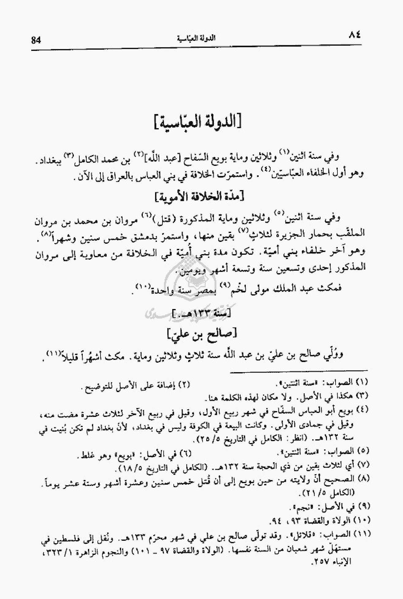 (¬4) بويع أبو العباس السفّاح في شهر ربيع الأول، وقيل في ربيع الآخر لثلاث عشرة مضت منه، وقيل في جمادى الأولى. وكانت البيعة في الكوفة وليس في بغداد، لأنّ بغداد لم تكن بنيت في سنة 132 هـ. (انظر: الكامل في التاريخ 5/ 25).