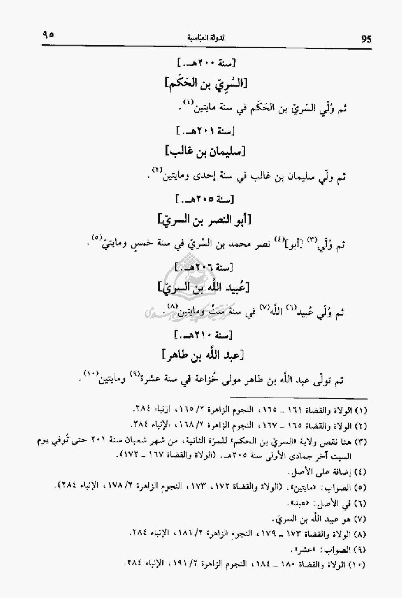 (¬3) هنا نقص ولاية «السريّ بن الحكم» للمرّة الثانية، من شهر شعبان سنة 201 حتى توفي يوم السبت آخر جمادى الأولى سنة 205 هـ. (الولاة والقضاة 167 - 172).