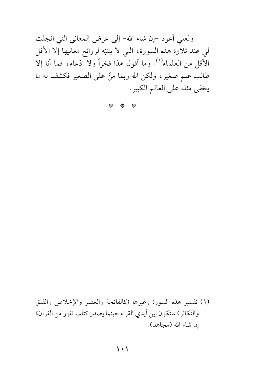 (¬1) تفسير هذه السورة وغيرها (كالفاتحة والعصر والإخلاص والفلق والتكاثر) ستكون بين أيدي القراء حينما يصدر كتاب «نور من القرآن» إن شاء الله (مجاهد).