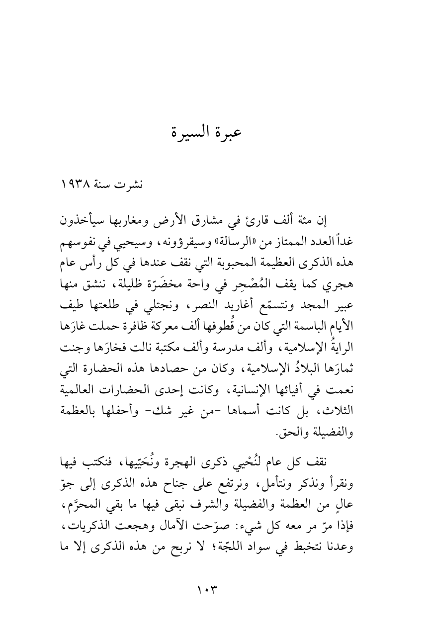 إن مئة ألف قارئ في مشارق الأرض ومغاربها سيأخذون غداً العدد الممتاز من «الرسالة» وسيقرؤونه، وسيحيي في نفوسهم هذه الذكرى العظيمة المحبوبة التي نقف عندها في كل رأس عام هجري كما يقف المُصْحِر في واحة مخضَرّة ظليلة، ننشق منها عبير المجد ونتسمّع أغاريد النصر، ونجتلي في طلعتها طيف الأيام الباسمة التي كان من قُطوفها ألف معركة ظافرة حملت غارَها الرايةُ الإسلامية، وألف مدرسة وألف مكتبة نالت فخارَها وجنت ثمارَها البلادُ الإسلامية، وكان من حصادها هذه الحضارة التي نعمت في أفيائها الإنسانية، وكانت إحدى الحضارات العالمية الثلاث، بل كانت أسماها -من غير شك- وأحفلها بالعظمة والفضيلة والحق.