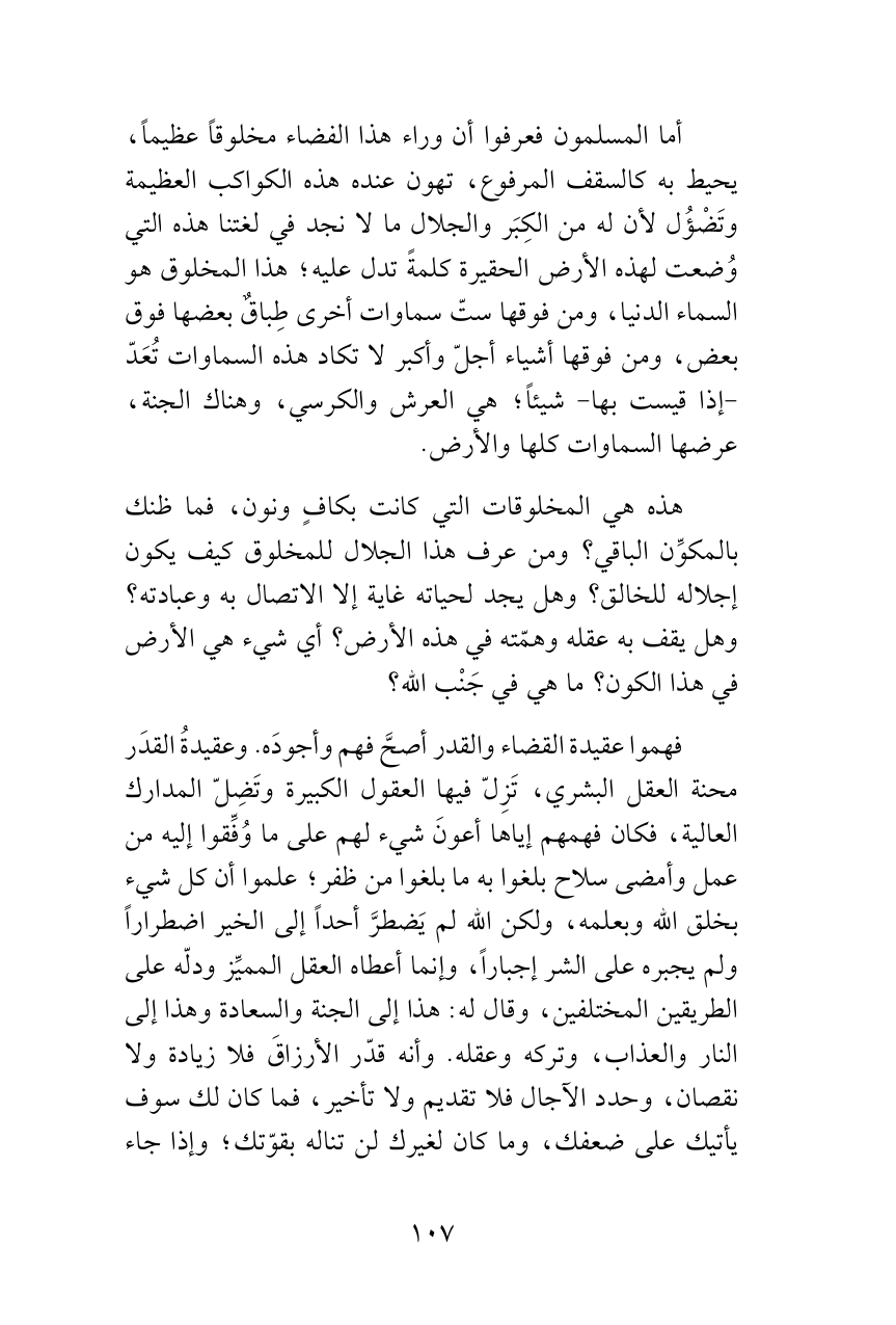هذه هي المخلوقات التي كانت بكافٍ ونون، فما ظنك بالمكوِّن الباقي؟ ومن عرف هذا الجلال للمخلوق كيف يكون إجلاله للخالق؟ وهل يجد لحياته غاية إلا الاتصال به وعبادته؟ وهل يقف به عقله وهمّته في هذه الأرض؟ أي شيء هي الأرض في هذا الكون؟ ما هي في جَنْب الله؟