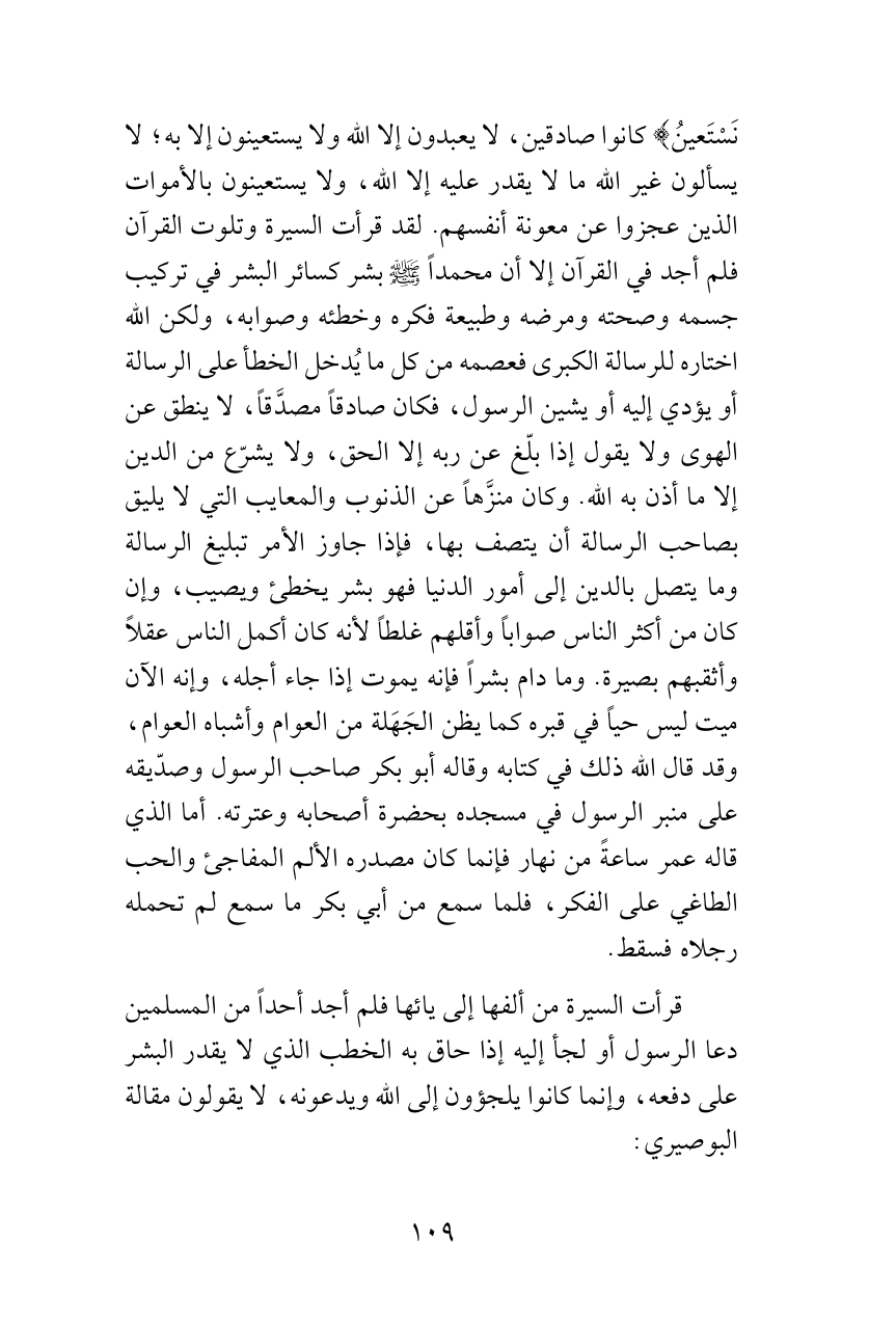 نَسْتَعينُ} كانوا صادقين، لا يعبدون إلا الله ولا يستعينون إلا به؛ لا يسألون غير الله ما لا يقدر عليه إلا الله، ولا يستعينون بالأموات الذين عجزوا عن معونة أنفسهم. لقد قرأت السيرة وتلوت القرآن فلم أجد في القرآن إلا أن محمداً صلى الله عليه وسلم بشر كسائر البشر في تركيب جسمه وصحته ومرضه وطبيعة فكره وخطئه وصوابه، ولكن الله اختاره للرسالة الكبرى فعصمه من كل ما يُدخل الخطأ على الرسالة أو يؤدي إليه أو يشين الرسول، فكان صادقاً مصدَّقاً، لا ينطق عن الهوى ولا يقول إذا بلّغ عن ربه إلا الحق، ولا يشرّع من الدين إلا ما أذن به الله. وكان منزَّهاً عن الذنوب والمعايب التي لا يليق بصاحب الرسالة أن يتصف بها، فإذا جاوز الأمر تبليغ الرسالة وما يتصل بالدين إلى أمور الدنيا فهو بشر يخطئ ويصيب، وإن كان من أكثر الناس صواباً وأقلهم غلطاً لأنه كان أكمل الناس عقلاً وأثقبهم بصيرة. وما دام بشراً فإنه يموت إذا جاء أجله، وإنه الآن ميت ليس حياً في قبره كما يظن الجَهَلة من العوام وأشباه العوام، وقد قال الله ذلك في كتابه وقاله أبو بكر صاحب الرسول وصدّيقه على منبر الرسول في مسجده بحضرة أصحابه وعترته. أما الذي قاله عمر ساعةً من نهار فإنما كان مصدره الألم المفاجئ والحب الطاغي على الفكر، فلما سمع من أبي بكر ما سمع لم تحمله رجلاه فسقط.