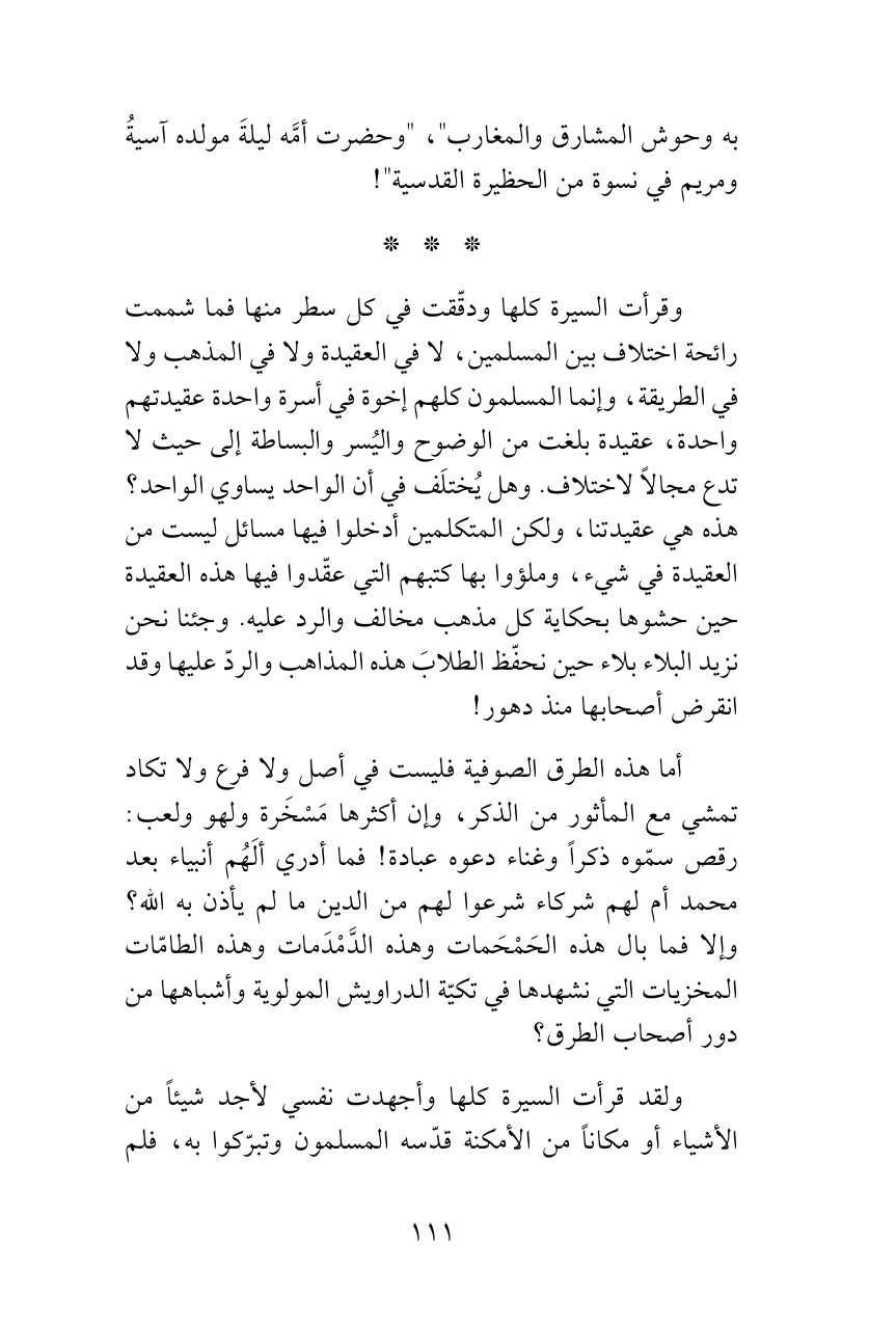 أما هذه الطرق الصوفية فليست في أصل ولا فرع ولا تكاد تمشي مع المأثور من الذكر، وإن أكثرها مَسْخَرة ولهو ولعب: رقص سمّوه ذكراً وغناء دعوه عبادة! فما أدري ألَهُم أنبياء بعد محمد أم لهم شركاء شرعوا لهم من الدين ما لم يأذن به الله؟ وإلا فما بال هذه الحَمْحَمات وهذه الدَّمْدَمات وهذه الطامّات المخزيات التي نشهدها في تكيّة الدراويش المولوية وأشباهها من دور أصحاب الطرق؟